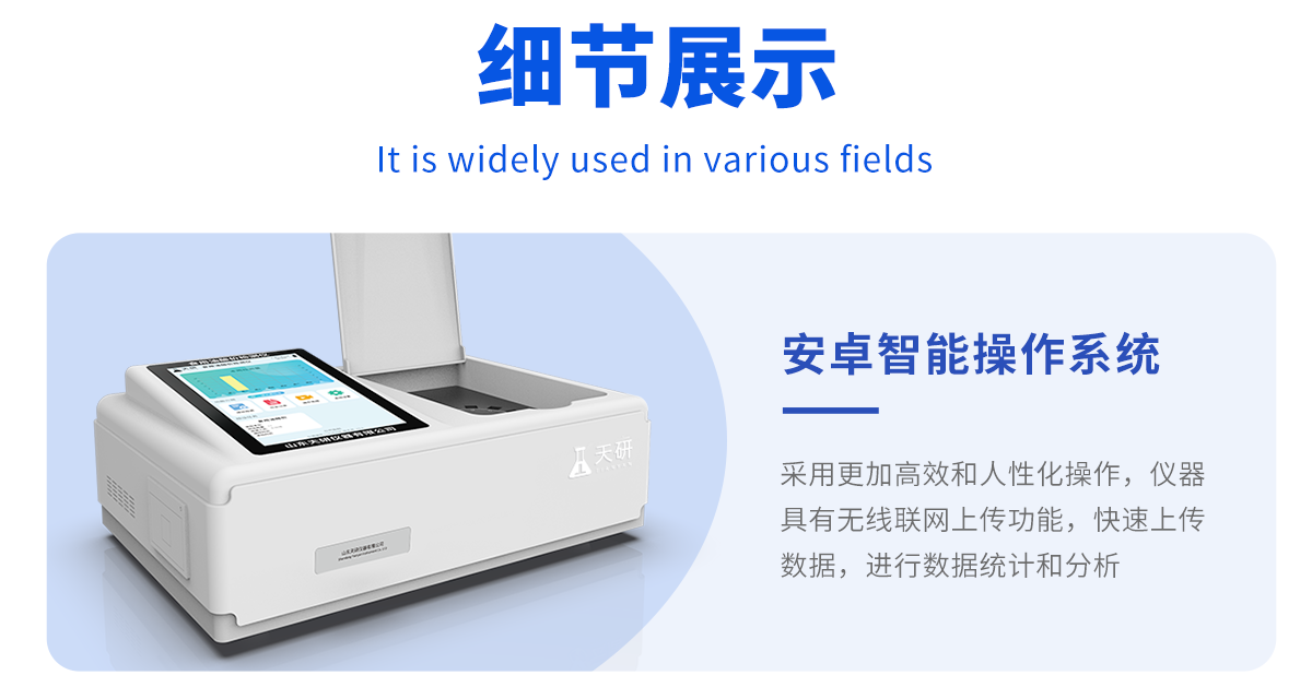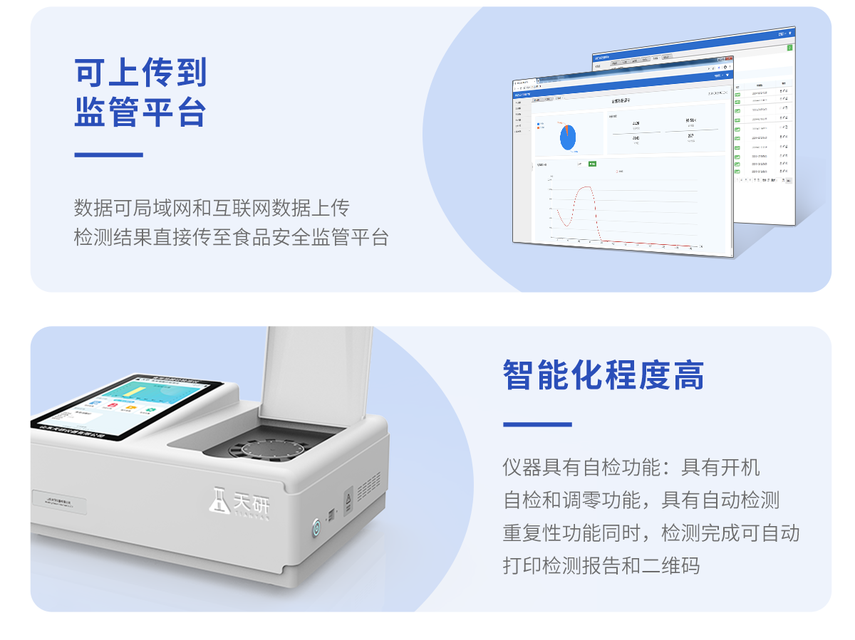 | 儀器采用臺(tái)式一體化系統(tǒng)檢測(cè)技術(shù),將分光光度模塊、新型農(nóng)殘檢測(cè)模塊、數(shù)字化管理模塊、無(wú)線通訊模塊高度集成于一體,支持檢測(cè)200種食品安全檢測(cè)項(xiàng)目,同時(shí)預(yù)留升級(jí)檢測(cè)方法。 | 儀器檢測(cè)模塊標(biāo)準(zhǔn)化、智能化,可隨意自由組合。檢測(cè)箱體內(nèi)置多個(gè)標(biāo)準(zhǔn)檢測(cè)單元,檢測(cè)模塊可以調(diào)整配置。 | 儀器采用全新安卓智能系統(tǒng),主控芯片采用 ARM Cortex-A7,RK3288/4核處理器,10.1寸高清液晶觸摸豎屏,更加**的UI交互界面,運(yùn)轉(zhuǎn)快捷;儀器配備無(wú)線通信模塊: 4G(APN)通訊模塊、Wifi模塊,藍(lán)牙傳輸,同時(shí)具有雙USB接口以及RJ45接口能以多種方式實(shí)現(xiàn)數(shù)據(jù)保存和數(shù)據(jù)傳輸功能。 | 創(chuàng)新檢測(cè)模式: | ★檢測(cè)通道:≥12通道;采用精密旋轉(zhuǎn)比色池設(shè)計(jì),使用同芯片同光源校準(zhǔn)精度,解決不同光源之間的誤差值。1-12通道間誤差0.1%。(**號(hào):ZL202022821055.2) | ★儀器具有自動(dòng)識(shí)別比色皿檢測(cè)功能,即:將樣品比色皿放入儀器后,點(diǎn)擊樣品檢測(cè),儀器自動(dòng)識(shí)別比色皿進(jìn)行通道檢測(cè)。 | 進(jìn)口高精光源: | 高精度進(jìn)口四波長(zhǎng)冷光源,通道配置 410、520、590、630nm 波長(zhǎng)光源,一個(gè)光源芯片驅(qū)動(dòng)一個(gè)光源,誤差極小,每臺(tái)設(shè)備單獨(dú)**校準(zhǔn)光源,**比對(duì),同時(shí)參照四種不同波段光源全方位覆蓋市面上99%的農(nóng)殘食品項(xiàng)目檢測(cè)。 | 智能化操作系統(tǒng): | 便捷操作系統(tǒng):設(shè)備檢測(cè)時(shí)可在同一檢測(cè)界面自動(dòng)對(duì)應(yīng)相關(guān)檢測(cè)通道一次性選擇1-12個(gè)樣品名稱,無(wú)須退出界面,節(jié)省操作時(shí)間。 | 數(shù)據(jù)集成系統(tǒng):設(shè)備首頁(yè)自動(dòng)統(tǒng)計(jì)檢測(cè)數(shù)據(jù)包含:周檢測(cè)數(shù)據(jù)、月檢測(cè)數(shù)據(jù),全部檢測(cè)總數(shù)量,均包含檢測(cè)總數(shù),合格數(shù),不合格數(shù),以及相關(guān)柱形分析圖,對(duì)各項(xiàng)檢測(cè)數(shù)據(jù)清晰掌握,無(wú)需電腦查詢,更加快捷直觀。 | 項(xiàng)目預(yù)設(shè)系統(tǒng):支持添加單個(gè)及多個(gè)相同或不相同的任務(wù)預(yù)設(shè),一鍵快速調(diào)取,每一個(gè)任務(wù)分別可以設(shè)置不同的樣品、批次、編號(hào)、來(lái)源、備注、抽樣信息、檢測(cè)信息、受檢信息、復(fù)核信息等更多信息。無(wú)縫鏈接平臺(tái)和APP實(shí)時(shí)查看下發(fā)任務(wù)。 | 數(shù)據(jù)監(jiān)管系統(tǒng):同步對(duì)接監(jiān)管平臺(tái),數(shù)據(jù)可局域網(wǎng)和互聯(lián)網(wǎng)數(shù)據(jù)上傳,檢測(cè)結(jié)果可選擇直接傳至食品安全監(jiān)管平臺(tái)。集成OSS輸出存儲(chǔ)服務(wù)、區(qū)分設(shè)備定向管理應(yīng)用,進(jìn)行區(qū)域食品安全監(jiān)管及大數(shù)據(jù)分析處理與數(shù)據(jù)統(tǒng)計(jì),檢測(cè)區(qū)域食品安全長(zhǎng)短期動(dòng)態(tài),達(dá)到食品安全問(wèn)題預(yù)估、預(yù)警。 | 自定義打印系統(tǒng):內(nèi)置全新打印系統(tǒng),新創(chuàng)自定義打印方式,可按需靈活設(shè)置開(kāi)啟或關(guān)閉:產(chǎn)品合格證(國(guó)家農(nóng)業(yè)部標(biāo)準(zhǔn)要求),二維碼,抽樣信息、檢測(cè)信息,受檢信息、復(fù)核信息、抽樣日期、檢測(cè)日期等信息的打印。 | 系統(tǒng)遠(yuǎn)程更新功能:可定向分客戶分儀器更新系統(tǒng),按照不同客戶后期實(shí)際需求添加項(xiàng)目,無(wú)需機(jī)器返廠,即可遠(yuǎn)程實(shí)時(shí)升級(jí)全新系統(tǒng),節(jié)省時(shí)間成本及避免運(yùn)輸造成設(shè)備損壞。 | 儀器主機(jī)采用一體化防水、抗壓、防撞擊、防腐蝕箱體設(shè)計(jì),同時(shí)配備交直流供電,可連接車載電源,可選配大容量充電鋰電池,滿足現(xiàn)場(chǎng)野外檢測(cè)需求。 | 安全證書,放心保障:儀器具有中國(guó)計(jì)量科學(xué)研究院校準(zhǔn)證書,**認(rèn)證。 |