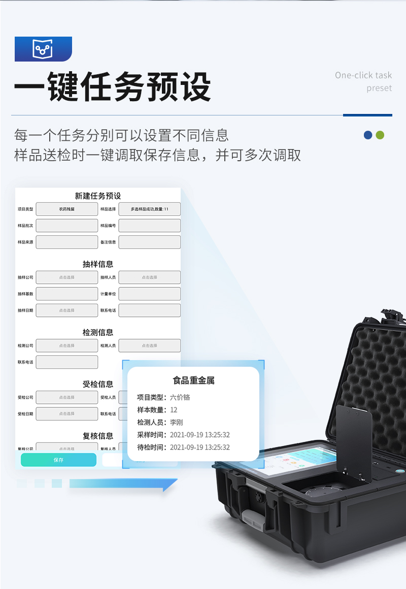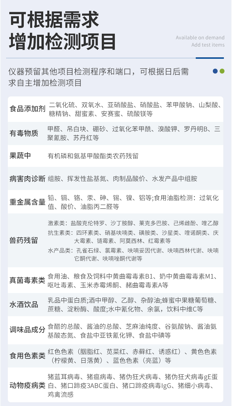 | 儀器采用手提一體化系統(tǒng)檢測技術(shù),將分光光度模塊、數(shù)字化管理模塊、無線通訊模塊高度集成于一體,可支持檢測60種食品安全檢測項(xiàng)目,同時(shí)預(yù)留升級檢測方法。 | 儀器檢測模塊標(biāo)準(zhǔn)化、智能化,檢測項(xiàng)目可隨意自由組合。檢測箱體內(nèi)置多個(gè)標(biāo)準(zhǔn)檢測單元,檢測模塊可以調(diào)整配置。 | 儀器采用全新安卓智能系統(tǒng),主控芯片采用 ARM Cortex-A7,RK3288/4核處理器,10.1寸高清液晶觸摸豎屏,更加**的UI交互界面,運(yùn)轉(zhuǎn)快捷;儀器配備無線通信模塊: 4G(APN)通訊模塊、Wifi模塊,藍(lán)牙傳輸,同時(shí)具有雙USB接口以及RJ45接口能以多種方式實(shí)現(xiàn)數(shù)據(jù)保存和數(shù)據(jù)傳輸功能。 | 顯示屏幕:儀器采用10.1英寸豎向液晶觸摸屏顯,搭配運(yùn)行安卓智能操作系統(tǒng),主控芯片采用ARM Cortex-A7,RK3288/4核處理器,主頻1.88Ghz,操作方便,性能更強(qiáng)。 | 檢測通道:≥12通道;采用精密旋轉(zhuǎn)比色池設(shè)計(jì),使用同芯片同光源校準(zhǔn)精度,解決不同光源之間的誤差值,更加準(zhǔn)確**。(1-12通道間誤差0.1%,**號:ZL202022821055.2) | 儀器光源:高精度進(jìn)口四波長冷光源,每個(gè)通道均配置 410、520、590、630nm 波長光源,標(biāo)配**的光路切換裝置,**光路切換功能可實(shí)現(xiàn)64波長,并且所有檢測項(xiàng)目可實(shí)現(xiàn)所有通道同時(shí)檢測。 | 設(shè)備可一鍵校準(zhǔn),自動(dòng)保存校準(zhǔn)數(shù)據(jù),自動(dòng)對比校驗(yàn),得到精準(zhǔn)光源,采用Android SP存儲數(shù)據(jù),光源數(shù)據(jù)永不丟失,方便每一次使用。 | 通訊接口:配備無線通信模塊、4G(APN)通訊模塊、藍(lán)牙傳輸,同時(shí)具有雙USB接口以及RJ45網(wǎng)線接口,可以多方式實(shí)現(xiàn)數(shù)據(jù)保存及數(shù)據(jù)傳輸。 | 存儲方式:支持U盤存儲,標(biāo)準(zhǔn)USB接口,免驅(qū)動(dòng)安裝。檢測結(jié)果存儲容量20萬條以上,可生成Excel表格進(jìn)行拷貝,并具有登錄保護(hù)功能。 | 智能化操作系統(tǒng): | 1、操作系統(tǒng):儀器可在同一檢測界面自動(dòng)對應(yīng)相關(guān)檢測通道,一次性選擇1-12個(gè)樣品名稱,無需退出界面,節(jié)省操作時(shí)間。并可以對每個(gè)通道屬性和樣品信息單獨(dú)進(jìn)行編輯,例如送檢單位、人員,檢測人員等,打印時(shí)勾選打印顯示。 | 2、數(shù)據(jù)集成系統(tǒng):設(shè)備首頁自動(dòng)匯總分析檢測數(shù)據(jù),包含:周檢測數(shù)據(jù)、月檢測數(shù)據(jù),全部檢測總數(shù)量,均包含檢測總數(shù),合格數(shù),不合格數(shù),以及相關(guān)柱形分析圖,各項(xiàng)檢測數(shù)據(jù)一目了然,無需電腦查詢,更加快捷直觀。 | 3、數(shù)據(jù)庫系統(tǒng):十幾項(xiàng)數(shù)據(jù)庫分類管理儀器:包含項(xiàng)目類型、項(xiàng)目數(shù)據(jù)、檢測數(shù)據(jù)、歷史記錄、國標(biāo)信息、曲線信息、采樣信息、檢測信息、受檢信息、復(fù)核信息、圖表信息、光源校準(zhǔn)信息、打印樣式信息、樣品庫信息等等,數(shù)據(jù)庫之間互相協(xié)調(diào)聯(lián)動(dòng)保證數(shù)據(jù)的真實(shí)完整性。同時(shí)產(chǎn)品數(shù)據(jù)庫以及歷史檢測記錄支持一鍵檢索功能。 | 4、限量規(guī)判系統(tǒng):具有限量查詢、添加物質(zhì)合規(guī)判定系統(tǒng)。檢測出結(jié)果后,系統(tǒng)自動(dòng)調(diào)用系統(tǒng)數(shù)據(jù)庫中相關(guān)國標(biāo)進(jìn)行比對判定,客觀顯示判定結(jié)果是否合格。 | 5、項(xiàng)目預(yù)設(shè)系統(tǒng):儀器具有任務(wù)預(yù)設(shè)模塊,一鍵提前預(yù)設(shè),給出方便快捷的新檢測方案,每一個(gè)任務(wù)分別可以設(shè)置不同的樣品、批次、編號、來源、備注、抽樣信息、檢測信息、受檢信息、復(fù)核信息等更多信息。樣品送檢時(shí)一鍵調(diào)取保存信息,并可多次調(diào)取,大大提高檢測效率。 | 6、數(shù)據(jù)監(jiān)管系統(tǒng):同步對接監(jiān)管平臺,數(shù)據(jù)可局域網(wǎng)和互聯(lián)網(wǎng)數(shù)據(jù)上傳,檢測結(jié)果可選擇直接傳至食品安全監(jiān)管平臺。進(jìn)行區(qū)域食品安全監(jiān)管及大數(shù)據(jù)分析處理與數(shù)據(jù)統(tǒng)計(jì),檢測區(qū)域食品安全長短期動(dòng)態(tài),達(dá)到食品安全問題預(yù)估、預(yù)警。 | 7、全新打印系統(tǒng):內(nèi)置全新打印機(jī),新創(chuàng)自定義打印方式,可按需靈活勾選控制:二維碼,抽樣信息、檢測信息,受檢信息、復(fù)核信息、抽樣日期、檢測日期等信息的打印。 | 8、A4紙版本報(bào)告打印功能(可選配):設(shè)備擁有兩種結(jié)果展示方式,可以自動(dòng)生成A4打印模板和小票打印模板兩種樣式,可通過WiFi及網(wǎng)線等方式鏈接外置打印機(jī)可進(jìn)行打印。 | 供電模式:儀器交直流兩用,直流12V供電,可連接車載電源,可配6ah大容量充電鋰電池,電量可實(shí)時(shí)顯示,方便戶外流動(dòng)測試。 | 儀器具備遠(yuǎn)程升級功能,可定向分客戶分儀器更新,開機(jī)后自動(dòng)更新,并可持續(xù)性免費(fèi)更新系統(tǒng)版本,無需像傳統(tǒng)產(chǎn)品返廠更新,節(jié)省時(shí)間及人力成本并避免了物流運(yùn)輸返廠升級導(dǎo)致設(shè)備損壞的潛在風(fēng)險(xiǎn)。 |