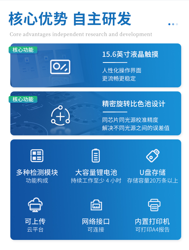 | 儀器采用臺(tái)式一體化系統(tǒng)檢測(cè)技術(shù),將分光光度模塊、膠體金檢測(cè)模塊、新型農(nóng)殘檢測(cè)模塊、數(shù)字化管理模塊、無(wú)線通訊模塊高度集成于一體,支持檢測(cè)200種食品安全檢測(cè)項(xiàng)目,同時(shí)預(yù)留升級(jí)檢測(cè)方法。 | 儀器檢測(cè)模塊標(biāo)準(zhǔn)化、智能化,可隨意自由組合。檢測(cè)箱體內(nèi)置多個(gè)標(biāo)準(zhǔn)檢測(cè)單元,檢測(cè)模塊可以調(diào)整配置。 | 儀器采用全新安卓智能系統(tǒng),主控芯片采用 ARM Cortex-A7,RK3288/4核處理器,10.1寸高清液晶觸摸豎屏,更加**的UI交互界面,運(yùn)轉(zhuǎn)快捷;儀器配備無(wú)線通信模塊: 4G(APN)通訊模塊、Wifi模塊,藍(lán)牙傳輸,同時(shí)具有雙USB接口以及RJ45接口能以多種方式實(shí)現(xiàn)數(shù)據(jù)保存和數(shù)據(jù)傳輸功能。 | 創(chuàng)新檢測(cè)模式★檢測(cè)通道:≥12通道;采用精密旋轉(zhuǎn)比色池設(shè)計(jì),使用同芯片同光源校準(zhǔn)精度,解決不同光源之間的誤差值。1-12通道間誤差0.1%。(**號(hào):ZL202022821055.2) ★儀器具有自動(dòng)識(shí)別比色皿檢測(cè)功能,即:將樣品比色皿放入儀器后,點(diǎn)擊樣品檢測(cè),儀器自動(dòng)識(shí)別比色皿進(jìn)行通道檢測(cè)。 | 進(jìn)口高精光源:高精度進(jìn)口四波長(zhǎng)冷光源,通道配置 410、520、590、630nm 波長(zhǎng)光源,一個(gè)光源芯片驅(qū)動(dòng)一個(gè)光源,誤差極小,每臺(tái)設(shè)備單獨(dú)**校準(zhǔn)光源,**比對(duì),同時(shí)參照四種不同波段光源全方位覆蓋市面上99%的農(nóng)殘食品項(xiàng)目檢測(cè)。 | 膠體金模塊檢測(cè)方式:★采用COMS實(shí)時(shí)成像技術(shù),可采集多個(gè)畫面,支持2個(gè)金標(biāo)同時(shí)讀卡,通過(guò)不同顏色的灰度變化,一秒精準(zhǔn)得出結(jié)果。 | 智能操作分析系統(tǒng): | ★便捷操作系統(tǒng):設(shè)備檢測(cè)時(shí)可在同一檢測(cè)界面自動(dòng)對(duì)應(yīng)相關(guān)檢測(cè)通道一次性選擇1-12個(gè)樣品名稱,無(wú)須退出界面,節(jié)省操作時(shí)間。(需提供對(duì)應(yīng)證明) | ★數(shù)據(jù)集成系統(tǒng):設(shè)備首頁(yè)自動(dòng)統(tǒng)計(jì)檢測(cè)數(shù)據(jù)包含:周檢測(cè)數(shù)據(jù)、月檢測(cè)數(shù)據(jù),全部檢測(cè)總數(shù)量,均包含檢測(cè)總數(shù),合格數(shù),不合格數(shù),以及相關(guān)柱形分析圖,對(duì)各項(xiàng)檢測(cè)數(shù)據(jù)清晰掌握,無(wú)需電腦查詢,更加快捷直觀。(需提供對(duì)應(yīng)證明文件) | ★項(xiàng)目預(yù)設(shè)系統(tǒng):支持添加單個(gè)及多個(gè)相同或不相同的任務(wù)預(yù)設(shè),一鍵快速調(diào)取,每一個(gè)任務(wù)分別可以設(shè)置不同的樣品、批次、編號(hào)、來(lái)源、備注、抽樣信息、檢測(cè)信息、受檢信息、復(fù)核信息等更多信息。無(wú)縫鏈接平臺(tái)和APP實(shí)時(shí)查看下發(fā)任務(wù)。(需提供對(duì)應(yīng)證明文件) | ★數(shù)據(jù)監(jiān)管系統(tǒng):同步對(duì)接監(jiān)管平臺(tái),數(shù)據(jù)可局域網(wǎng)和互聯(lián)網(wǎng)數(shù)據(jù)上傳,檢測(cè)結(jié)果可選擇直接傳至食品安全監(jiān)管平臺(tái)。集成OSS輸出存儲(chǔ)服務(wù)、區(qū)分設(shè)備定向管理應(yīng)用,進(jìn)行區(qū)域食品安全監(jiān)管及大數(shù)據(jù)分析處理與數(shù)據(jù)統(tǒng)計(jì),檢測(cè)區(qū)域食品安全長(zhǎng)短期動(dòng)態(tài),達(dá)到食品安全問(wèn)題預(yù)估、預(yù)警。(需提供對(duì)應(yīng)食品理化分析系統(tǒng)計(jì)算機(jī)軟件著作權(quán))。 | ★ 自定義打印系統(tǒng):內(nèi)置全新打印系統(tǒng),新創(chuàng)自定義打印方式,可按需靈活設(shè)置開(kāi)啟或關(guān)閉:產(chǎn)品合格證(國(guó)家農(nóng)業(yè)部標(biāo)準(zhǔn)要求),二維碼,抽樣信息、檢測(cè)信息,受檢信息、復(fù)核信息、抽樣日期、檢測(cè)日期等信息的打印。(需提供對(duì)應(yīng)證明) | ★系統(tǒng)遠(yuǎn)程更新功能:可定向分客戶分儀器更新系統(tǒng),按照不同客戶后期實(shí)際需求添加項(xiàng)目,無(wú)需機(jī)器返廠,即可遠(yuǎn)程實(shí)時(shí)升級(jí)全新系統(tǒng),節(jié)省時(shí)間成本及避免運(yùn)輸造成設(shè)備損壞。 | 儀器主機(jī)采用一體化防水、抗壓、防撞擊、防腐蝕箱體設(shè)計(jì),同時(shí)配備交直流供電,可連接車載電源,可選配大容量充電鋰電池,滿足現(xiàn)場(chǎng)野外檢測(cè)需求。 | 安全證書(shū),放心保障:儀器具有中國(guó)計(jì)量科學(xué)研究院校準(zhǔn)證書(shū),**認(rèn)證。 |