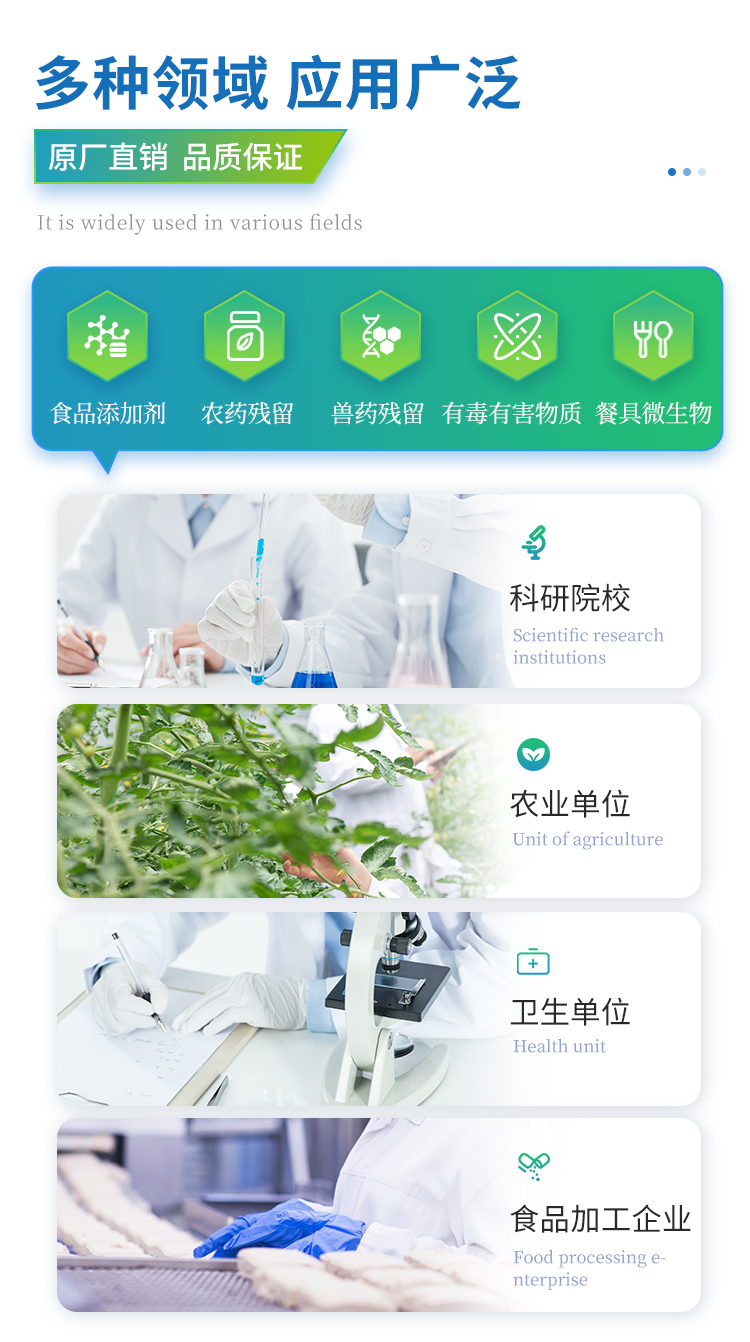 | 食品添加劑:二氧化硫、雙氧水、亞硝酸鹽、硝酸鹽、苯甲酸鈉、山梨酸鉀、糖精鈉、甜蜜素、木耳硫酸鎂等 | 有毒有害物質(zhì):甲醛、吊白塊、硼砂、過(guò)氧化苯甲酰、溴酸鉀、羅丹明B、三聚氰胺、蘇丹紅、工業(yè)堿、尿素、明礬等 | 果蔬:農(nóng)藥殘留(酶抑制率法) | 病害肉:組胺、揮發(fā)性鹽基氮 | 重金屬含量:鉛、鎘、鉻、汞、砷、錫、鎳、鋁等 | 水酒飲品分析:酒中甲醇、乙醇、乳品及牛奶中蛋白質(zhì) | 調(diào)味品成分: 食醋的總酸、醬油的總酸、芝麻油純度、谷氨酸鈉、醬油氨基酸態(tài)氮、食鹽中亞鐵氰化鉀、食鹽中碘等 | 食用色素類:紅色色素(胭脂紅、莧菜紅、莧菜紅)、黃色色素(檸檬黃、日落黃)、藍(lán)色色素(亮藍(lán))等 | 蜂蜜成分:果糖和葡萄糖、蔗糖、淀粉酶、酸度等 | 食用油脂:過(guò)氧化值、酸價(jià)等 |