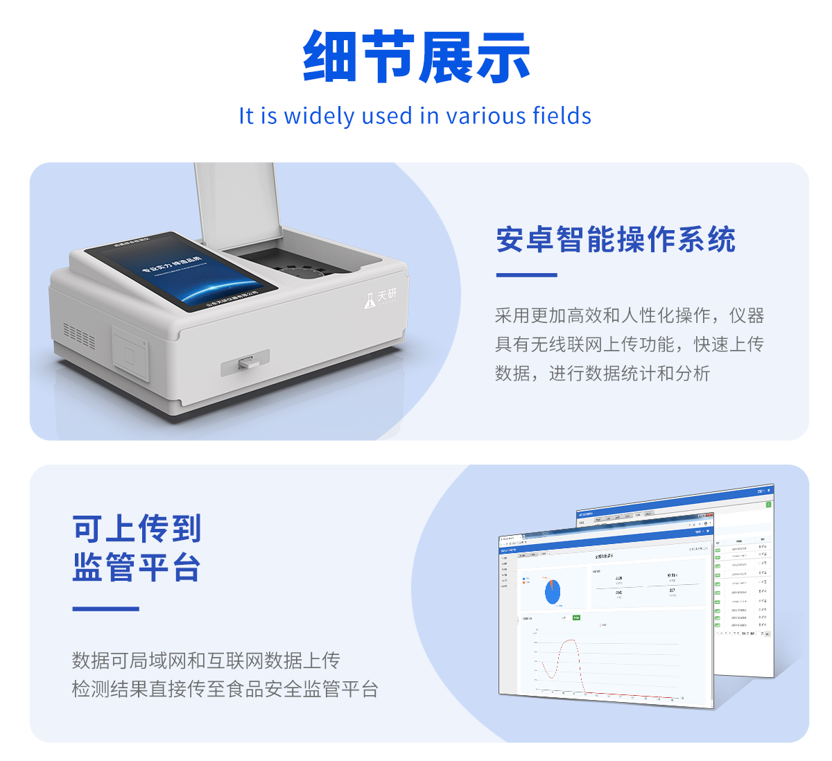 | 儀器采用臺式一體化系統(tǒng)檢測技術,將分光光度模塊、膠體金檢測模塊、新型農(nóng)殘檢測模塊、數(shù)字化管理模塊、無線通訊模塊高度集成于一體,支持檢測200種食品安全檢測項目,同時預留升級檢測方法。 | 儀器檢測模塊標準化、智能化,可隨意自由組合。檢測箱體內置多個標準檢測單元,檢測模塊可以調整配置。 | 儀器采用全新安卓智能系統(tǒng),主控芯片采用 ARM Cortex-A7,RK3288/4核處理器,10.1寸高清液晶觸摸豎屏,更加**的UI交互界面,運轉快捷;儀器配備無線通信模塊: 4G(APN)通訊模塊、Wifi模塊,藍牙傳輸,同時具有雙USB接口以及RJ45接口能以多種方式實現(xiàn)數(shù)據(jù)保存和數(shù)據(jù)傳輸功能。 | 創(chuàng)新檢測模式: | ★檢測通道:≥12通道;采用精密旋轉比色池設計,使用同芯片同光源校準精度,解決不同光源之間的誤差值。1-12通道間誤差0.1%。(**號:ZL202022821055.2) | ★儀器具有自動識別比色皿檢測功能,即:將樣品比色皿放入儀器后,點擊樣品檢測,儀器自動識別比色皿進行通道檢測。 | 進口高精光源: | 高精度進口四波長冷光源,通道配置 410、520、590、630nm 波長光源,一個光源芯片驅動一個光源,誤差極小,每臺設備單獨**校準光源,**比對,同時參照四種不同波段光源全方位覆蓋市面上99%的農(nóng)殘食品項目檢測。 | 膠體金模塊檢測方式: | 采用COMS實時成像技術,可采集多個畫面,支持3個金標同時讀卡,通過不同顏色的灰度變化,一秒精準得出結果。 | 智能化操作系統(tǒng): | 便捷操作系統(tǒng):設備檢測時可在同一檢測界面自動對應相關檢測通道一次性選擇1-12個樣品名稱,無須退出界面,節(jié)省操作時間。 | 數(shù)據(jù)集成系統(tǒng):設備首頁自動統(tǒng)計檢測數(shù)據(jù)包含:周檢測數(shù)據(jù)、月檢測數(shù)據(jù),全部檢測總數(shù)量,均包含檢測總數(shù),合格數(shù),不合格數(shù),以及相關柱形分析圖,對各項檢測數(shù)據(jù)清晰掌握,無需電腦查詢,更加快捷直觀。 | 項目預設系統(tǒng):支持添加單個及多個相同或不相同的任務預設,一鍵快速調取,每一個任務分別可以設置不同的樣品、批次、編號、來源、備注、抽樣信息、檢測信息、受檢信息、復核信息等更多信息。無縫鏈接平臺和APP實時查看下發(fā)任務。 | 數(shù)據(jù)監(jiān)管系統(tǒng):同步對接監(jiān)管平臺,數(shù)據(jù)可局域網(wǎng)和互聯(lián)網(wǎng)數(shù)據(jù)上傳,檢測結果可選擇直接傳至食品安全監(jiān)管平臺。集成OSS輸出存儲服務、區(qū)分設備定向管理應用,進行區(qū)域食品安全監(jiān)管及大數(shù)據(jù)分析處理與數(shù)據(jù)統(tǒng)計,檢測區(qū)域食品安全長短期動態(tài),達到食品安全問題預估、預警。 | 自定義打印系統(tǒng):內置全新打印系統(tǒng),新創(chuàng)自定義打印方式,可按需靈活設置開啟或關閉:產(chǎn)品合格證(國家農(nóng)業(yè)部標準要求),二維碼,抽樣信息、檢測信息,受檢信息、復核信息、抽樣日期、檢測日期等信息的打印。 | 系統(tǒng)遠程更新功能:可定向分客戶分儀器更新系統(tǒng),按照不同客戶后期實際需求添加項目,無需機器返廠,即可遠程實時升級全新系統(tǒng),節(jié)省時間成本及避免運輸造成設備損壞。 | 儀器主機采用一體化防水、抗壓、防撞擊、防腐蝕箱體設計,同時配備交直流供電,可連接車載電源,可選配大容量充電鋰電池,滿足現(xiàn)場野外檢測需求。 | 安全證書,放心保障:儀器具有中國計量科學研究院校準證書,**認證。 |