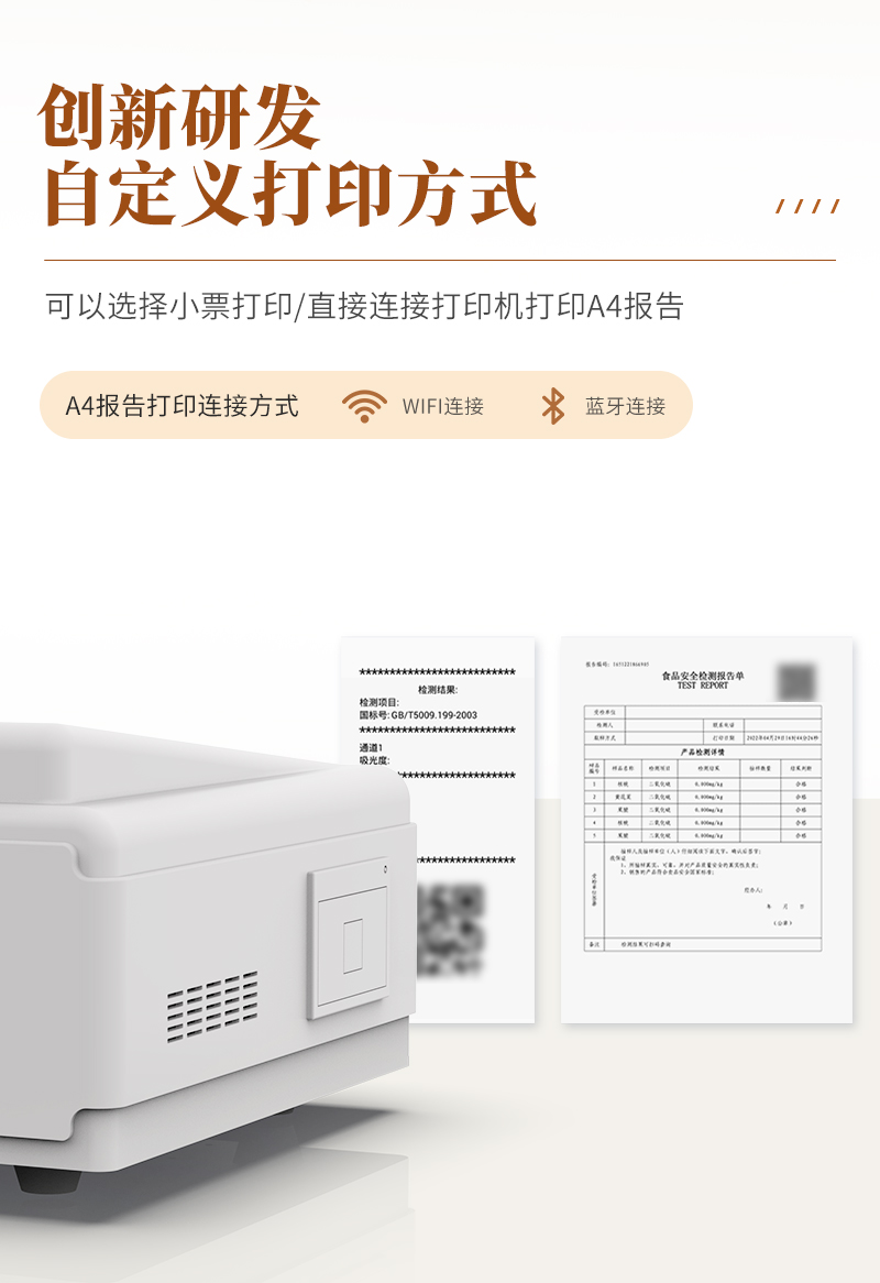 | 儀器采用臺式一體化系統(tǒng)檢測技術(shù),將分光光度模塊、數(shù)字化管理模塊、無線通訊模塊高度集成于一體,支持檢測200種食品安全檢測項目,同時預留升級檢測方法。 | 儀器檢測模塊標準化、智能化,檢測項目可隨意自由組合。檢測箱體內(nèi)置多個標準檢測單元,檢測模塊可以調(diào)整配置。 | 顯示屏幕:儀器采用10.1英寸豎向液晶觸摸屏顯,搭配運行安卓智能操作系統(tǒng),主控芯片采用ARM Cortex-A7,RK3288/4核處理器,主頻1.88Ghz,操作方便,性能更強。 | 檢測通道:≥12通道;采用精密旋轉(zhuǎn)比色池設(shè)計,使用同芯片同光源校準精度,解決不同光源之間的誤差值,更加準確**。(1-12通道間誤差0.1%,**號:ZL202022821055.2) | 儀器光源:高精度進口四波長冷光源,每個通道均配置 410、520、590、630nm 波長光源,標配**的光路切換裝置,**光路切換功能可實現(xiàn)64波長,并且所有檢測項目可實現(xiàn)所有通道同時檢測。 | 設(shè)備可一鍵校準,自動保存校準數(shù)據(jù),自動對比校驗,得到精準光源,采用Android SP存儲數(shù)據(jù),光源數(shù)據(jù)永不丟失,方便每一次使用。 | 通訊接口:配備無線通信模塊、可選配4G(APN)通訊模塊和藍牙傳輸,同時具有雙USB接口以及RJ45網(wǎng)線接口,可以多方式實現(xiàn)數(shù)據(jù)保存及數(shù)據(jù)傳輸。 | 存儲方式:支持U盤存儲,標準USB接口,免驅(qū)動安裝。檢測結(jié)果存儲容量20萬條以上,可生成Excel表格進行拷貝,并具有登錄保護功能。 | 智能化操作系統(tǒng): | 1)操作系統(tǒng):儀器可在同一檢測界面自動對應(yīng)相關(guān)檢測通道,一次性選擇1-12個樣品名稱,無需退出界面,節(jié)省操作時間。并可以對每個通道屬性和樣品信息單獨進行編輯,例如送檢單位、人員,檢測人員等,打印時勾選打印顯示。 | 2)數(shù)據(jù)集成系統(tǒng):設(shè)備首頁自動匯總分析檢測數(shù)據(jù),包含:周檢測數(shù)據(jù)、月檢測數(shù)據(jù),全部檢測總數(shù)量,均包含檢測總數(shù),合格數(shù),不合格數(shù),以及相關(guān)柱形分析圖,各項檢測數(shù)據(jù)一目了然,無需電腦查詢,更加快捷直觀。 | 3)數(shù)據(jù)庫系統(tǒng):十幾項數(shù)據(jù)庫分類管理儀器:包含項目類型、項目數(shù)據(jù)、檢測數(shù)據(jù)、歷史記錄、國標信息、曲線信息、采樣信息、檢測信息、受檢信息、復核信息、圖表信息、光源校準信息、打印樣式信息、樣品庫信息等等,數(shù)據(jù)庫之間互相協(xié)調(diào)聯(lián)動保證數(shù)據(jù)的真實完整性。同時產(chǎn)品數(shù)據(jù)庫以及歷史檢測記錄支持一鍵檢索功能。 | 4)限量規(guī)判系統(tǒng):具有限量查詢、添加物質(zhì)合規(guī)判定系統(tǒng)。檢測出結(jié)果后,系統(tǒng)自動調(diào)用系統(tǒng)數(shù)據(jù)庫中相關(guān)國標進行比對判定,客觀顯示判定結(jié)果是否合格。 | 5)項目預設(shè)系統(tǒng):儀器具有任務(wù)預設(shè)模塊,一鍵提前預設(shè),給出方便快捷的新檢測方案,每一個任務(wù)分別可以設(shè)置不同的樣品、批次、編號、來源、備注、抽樣信息、檢測信息、受檢信息、復核信息等更多信息。樣品送檢時一鍵調(diào)取保存信息,并可多次調(diào)取,大大提高檢測效率。 | 6)數(shù)據(jù)監(jiān)管系統(tǒng):同步對接監(jiān)管平臺,數(shù)據(jù)可局域網(wǎng)和互聯(lián)網(wǎng)數(shù)據(jù)上傳,檢測結(jié)果可選擇直接傳至食品安全監(jiān)管平臺。進行區(qū)域食品安全監(jiān)管及大數(shù)據(jù)分析處理與數(shù)據(jù)統(tǒng)計,檢測區(qū)域食品安全長短期動態(tài),達到食品安全問題預估、預警。 | 7)打印系統(tǒng):內(nèi)置全新打印機,新創(chuàng)自定義打印方式,可按需靈活勾選控制:產(chǎn)品合格證(國家農(nóng)業(yè)部標準要求),二維碼,抽樣信息、檢測信息,受檢信息、復核信息、抽樣日期、檢測日期等信息的打印。 | 供電模式:儀器交直流兩用,直流12V供電,可連接車載電源,可配6ah大容量充電鋰電池,電量可實時顯示,方便戶外流動測試。 | 儀器加入遠程升級功能,可定向分客戶分儀器更新,開機后自動更新,客戶無需任何操作,即可升級全新項目。做到了無需退換機器即可實現(xiàn)實時遠程升級檢測儀器。 | 設(shè)備尺寸:(長*寬*高)440*300*180mm | 儀器加入遠程升級功能,可定向分客戶分儀器更新,開機后自動更新,客戶無需任何操作,即可升級全新項目。做到了無需退換機器即可實現(xiàn)實時遠程升級檢測儀器。 |