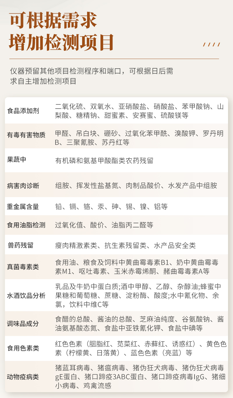 | 食品添加劑:二氧化硫、雙氧水、亞硝酸鹽、硝酸鹽、苯甲酸鈉、山梨酸鉀、糖精鈉、甜蜜素、木耳硫酸鎂等 | 有毒有害物質(zhì):甲醛、吊白塊、硼砂、過(guò)氧化苯甲酰、溴酸鉀、羅丹明B、三聚氰胺、蘇丹紅、工業(yè)堿、尿素、明礬等 | 果蔬:農(nóng)藥殘留(酶抑制率法) | 病害肉診斷:組胺、揮發(fā)性鹽基氮; | 重金屬含量:鉛、鎘、鉻、汞、砷、錫、鎳、鋁等; | 食用油脂: 過(guò)氧化值、酸價(jià)等 | 瘦肉精激素類(獸藥):鹽酸克倫特羅、沙丁胺醇、萊克多巴胺、己烯雌酚等 | 抗生素殘留類(獸藥):四環(huán)素類、硝基呋喃類、磺胺類、β-興奮劑類、沙星類、磺胺類、喹諾酮類,甲砜霉素,氟苯尼考,金剛烷胺、替米考星、慶大霉素、林可霉素、鏈霉素、恩諾沙星、環(huán)丙沙星、頭孢啦啶、青霉素、阿莫西林等 | 真菌毒素類:食用油、糧食及飼料中黃曲霉毒素B1、黃曲霉毒素總量,奶中黃曲霉毒素M1、嘔吐毒素、玉米赤霉烯酮、赭曲霉毒素A、T2毒素、伏馬毒素等; | 水酒飲品分析:酒中甲醇、乙醇、乳品及牛奶中蛋白質(zhì), | 調(diào)味品成分:食醋的總酸、醬油的總酸、芝麻油純度、谷氨酸鈉、醬油氨基酸態(tài)氮、食鹽中亞鐵氰化鉀、食鹽中碘等 | 食用色素類:紅色色素(胭脂紅、莧菜紅、赤蘚紅、誘惑紅)、黃色色素(檸檬黃、日落黃)、藍(lán)色色素(亮藍(lán))等 | 動(dòng)物疫病類:禽流感、新城疫、牛羊口蹄疫、牛羊結(jié)核病、牛羊包蟲(chóng)、牛羊布病、小反芻獸、豬藍(lán)耳病毒、豬瘟病毒、豬偽狂犬病毒、豬細(xì)小、豬圓環(huán)、犬細(xì)小病毒、犬瘟熱病毒、犬狂犬病毒等; | 蜂蜜成分:果糖和葡萄糖、蔗糖、淀粉酶、酸度等 | 水產(chǎn)品安全類:孔雀石綠、氯霉素、呋喃妥因、呋喃西林、呋喃它酮、呋喃唑酮等 | 蛋類藥物殘留:氯霉素,四環(huán)素,磺胺類,喹諾酮類,呋喃西林,呋喃它酮,呋喃妥因,呋喃唑酮,氟苯尼考,阿莫西林、頭孢氨芐、紅霉素、鏈霉素等 |