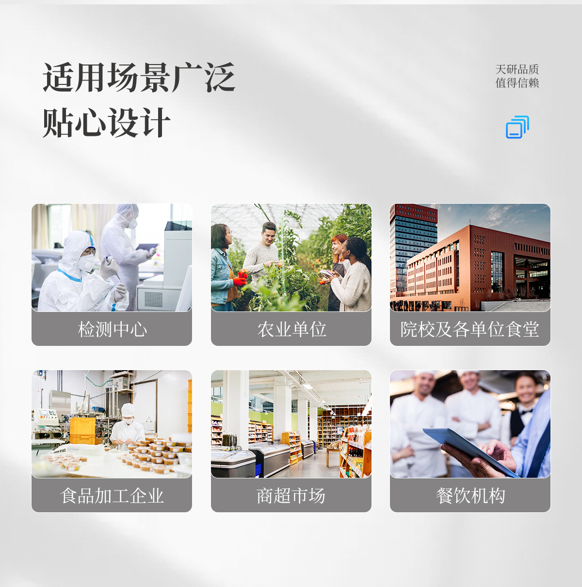 多功能食品安全檢測(cè)儀可快速檢測(cè)200多項(xiàng)目,包含非食用化學(xué)物質(zhì)、濫用食品添加劑、農(nóng)藥殘留、獸藥殘留、重金屬、病害肉、營(yíng)養(yǎng)強(qiáng)化劑、抗生素類(lèi)殘留、激素類(lèi)殘留、真菌毒素類(lèi)殘留、化學(xué)類(lèi)殘留等現(xiàn)場(chǎng)的定性定量檢測(cè)。該多功能食品安全檢測(cè)儀為集成化食品安全快速檢測(cè)分析設(shè)備,廣泛應(yīng)用于市場(chǎng)監(jiān)管局、檢測(cè)中心、衛(wèi)生監(jiān)督部門(mén)、農(nóng)業(yè)部門(mén)、院校及各單位食堂、食品肉產(chǎn)品深加工企業(yè)、商超市場(chǎng)、司法部門(mén)、餐飲機(jī)構(gòu)、養(yǎng)殖場(chǎng)、屠宰場(chǎng)、檢驗(yàn)檢疫部門(mén)等單位使用。