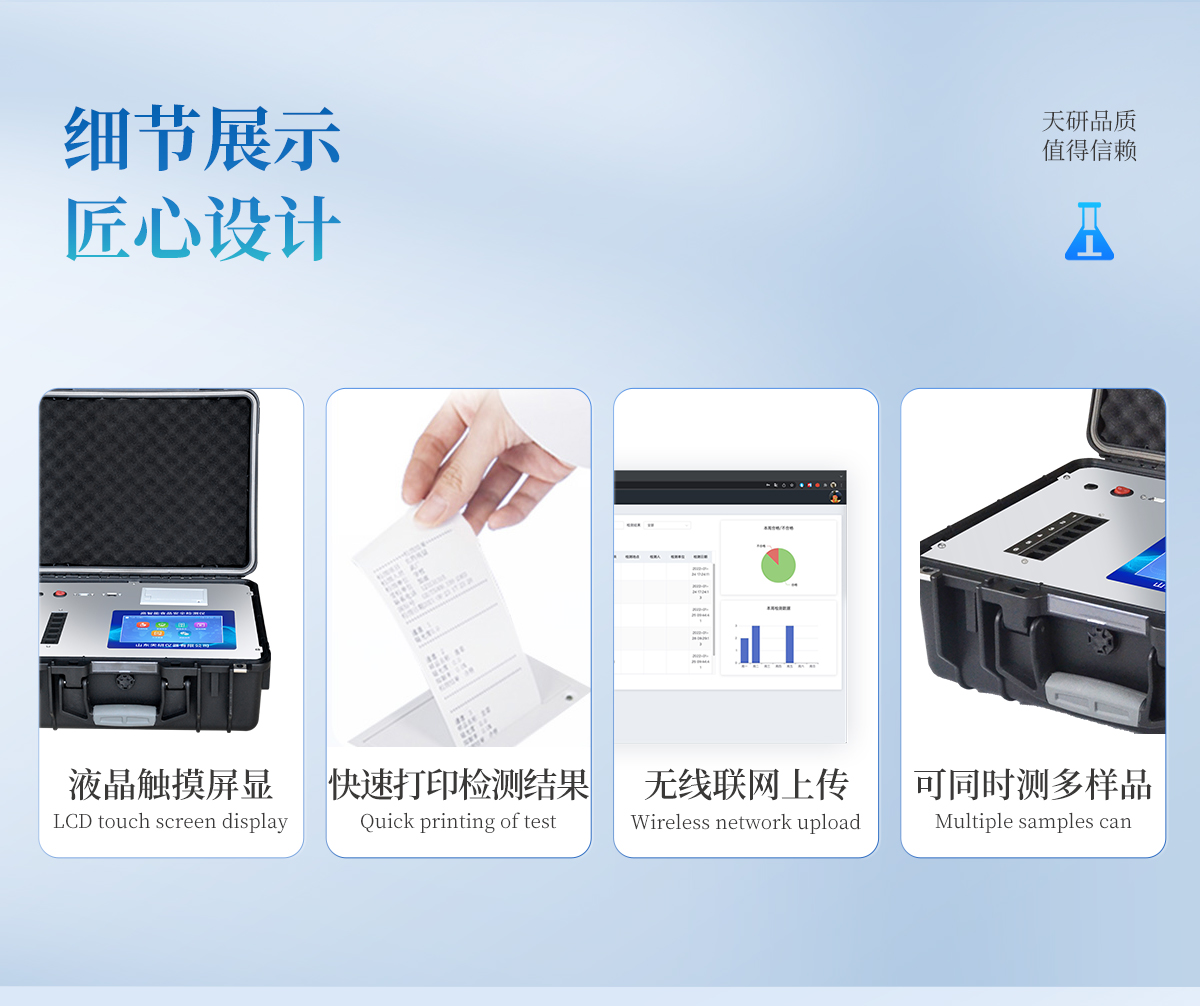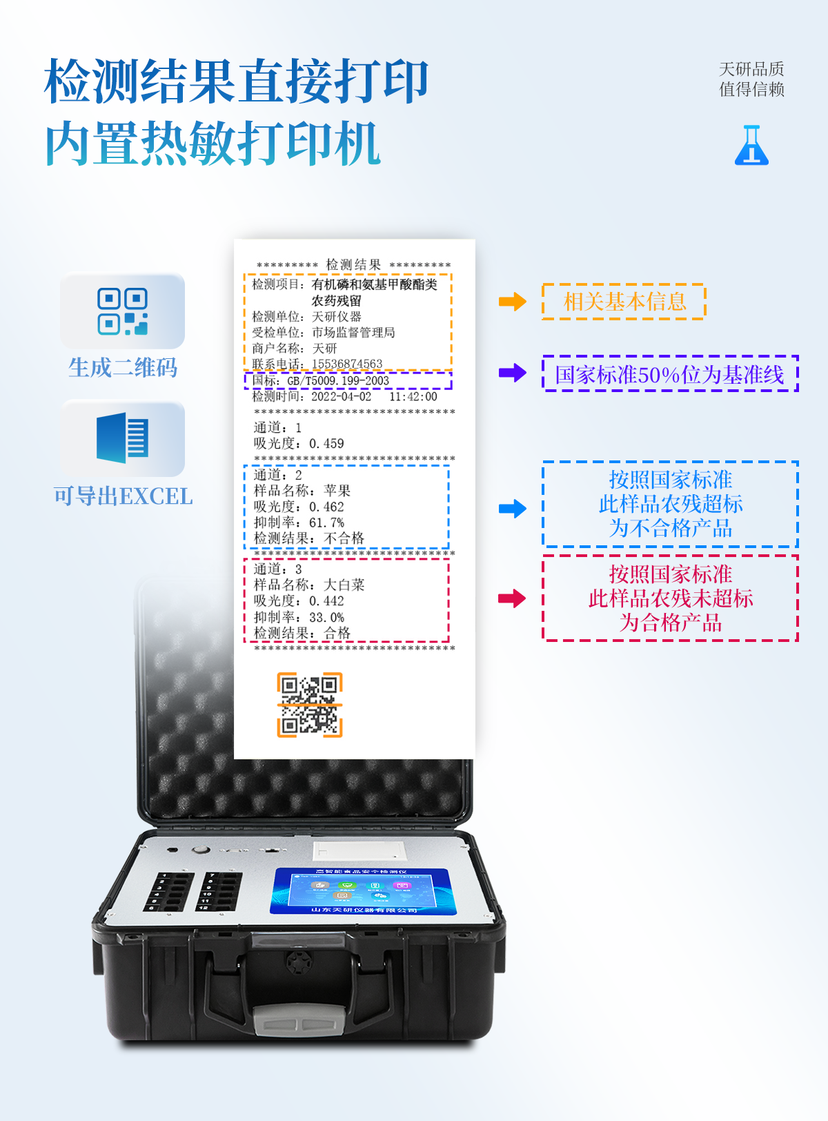| 安卓智能操作系統(tǒng),采用更加**的UI交互界面,儀器具有wifi聯(lián)網(wǎng)上傳、4G聯(lián)網(wǎng)傳輸、GPRS無(wú)線(xiàn)遠(yuǎn)傳、網(wǎng)線(xiàn)連接功能,快速批量上傳數(shù)據(jù)。 | 智能化程度高,儀器具有自檢功能:具有開(kāi)機(jī)自檢和調(diào)零功能,具有自動(dòng)檢測(cè)重復(fù)性功能。 | 新一代高速熱敏打印機(jī),檢測(cè)完成可自動(dòng)打印或批量打印檢測(cè)報(bào)告和二維碼。 | 儀器帶有監(jiān)管平臺(tái),數(shù)據(jù)可局域網(wǎng)和互聯(lián)網(wǎng)數(shù)據(jù)上傳,檢測(cè)結(jié)果直接傳至食品安全監(jiān)管平臺(tái)。進(jìn)行區(qū)域食品安全監(jiān)管及大數(shù)據(jù)分析處理與數(shù)據(jù)統(tǒng)計(jì),檢測(cè)區(qū)域食品安全長(zhǎng)短期動(dòng)態(tài),達(dá)到食品安全問(wèn)題預(yù)估、預(yù)警 | 一體化主機(jī),包含食品安全檢測(cè)模塊、多通道農(nóng)藥殘留檢測(cè)模塊、膠體金免疫層析檢測(cè)模塊。 | 一體化便攜式快檢設(shè)備,滿(mǎn)足現(xiàn)場(chǎng)及流動(dòng)檢測(cè)使用需求,能夠在同一軟件下實(shí)現(xiàn)所有檢測(cè)項(xiàng)目的檢測(cè),并可通過(guò)同一窗口直觀顯示檢測(cè)結(jié)果。 | 膠體金模塊檢測(cè)方式:軌道式自動(dòng)傳輸掃描,檢測(cè)完成后自動(dòng)退出檢測(cè)卡。 | CT線(xiàn)自動(dòng)識(shí)別,無(wú)需手動(dòng)調(diào)整。 | 內(nèi)置強(qiáng)大的數(shù)據(jù)庫(kù),具有多品類(lèi)多種類(lèi)樣品菜單功能,可靈活選擇檢測(cè)樣品,不同的檢測(cè)通道可同時(shí)檢測(cè)不同的樣品項(xiàng)目。也可在儀器上直接編輯錄入樣品名稱(chēng)、檢測(cè)指標(biāo)、送檢單位等信息并保存進(jìn)樣品數(shù)據(jù)庫(kù)。 | 產(chǎn)品內(nèi)置操作演示視頻,是您身邊的化驗(yàn)指導(dǎo)專(zhuān)家。 | 樣品處理簡(jiǎn)單省力,整體操作快速、安全、便捷。 | 儀器具有自身保護(hù)功能,可設(shè)置用戶(hù)名及密碼,防止非工作人員操作等。 | 高靈敏度,高檢測(cè)精度,高重復(fù)性精度,掃描式高精度光學(xué)傳感器。 | 結(jié)果判定線(xiàn)可修改,對(duì)照值標(biāo)定值可保存,斷電不丟失數(shù)據(jù)。 | 兼容市場(chǎng)上所有的膠體金卡,使用耗材不受限制,極大增強(qiáng)用戶(hù)使用體驗(yàn)。 | 儀器具有重新校準(zhǔn)、鎖定、恢復(fù)出廠設(shè)置功能。 |