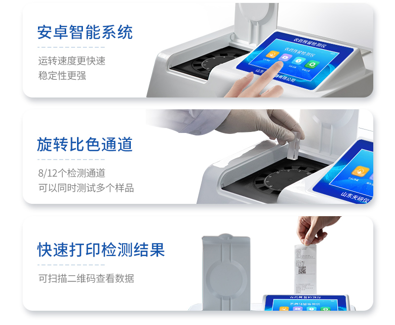 | 安卓智能操作系統(tǒng),采用更加**和人性化操作,儀器具有無線聯(lián)網(wǎng)上傳功能,快速上傳數(shù)據(jù),進(jìn)行數(shù)據(jù)統(tǒng)計(jì)和分析。 | 智能化程度高,儀器具有自檢功能:具有開機(jī)自檢和調(diào)零功能,具有自動檢測重復(fù)性功能;同時(shí),檢測完成可自動打印檢測報(bào)告和二維碼。手機(jī)掃碼可顯示出詳細(xì)檢測信息。 | 儀器帶有監(jiān)管平臺,數(shù)據(jù)可局域網(wǎng)和互聯(lián)網(wǎng)數(shù)據(jù)上傳,檢測結(jié)果直接傳至食品安全監(jiān)管平臺。進(jìn)行區(qū)域食品安全監(jiān)管及大數(shù)據(jù)分析處理與數(shù)據(jù)統(tǒng)計(jì),檢測區(qū)域食品安全長短期動態(tài),達(dá)到食品安全問題預(yù)估、預(yù)警 。 | 樣品處理簡單省力,整體操作快速、安全、便捷。 | 儀器具有自身保護(hù)功能,可設(shè)置用戶名及密碼,防止非工作人員操作等。 | 內(nèi)置強(qiáng)大的數(shù)據(jù)庫,可在儀器上直接選擇樣品名稱、檢測指標(biāo)、送檢單位等信息,也可在儀器上直接編輯錄入樣品名稱、檢測指標(biāo)、送檢單位等信息并保存進(jìn)樣品數(shù)據(jù)庫,方便后期操作調(diào)取使用。 | 儀器具有重新校準(zhǔn)、鎖定、恢復(fù)出廠設(shè)置功能。 |