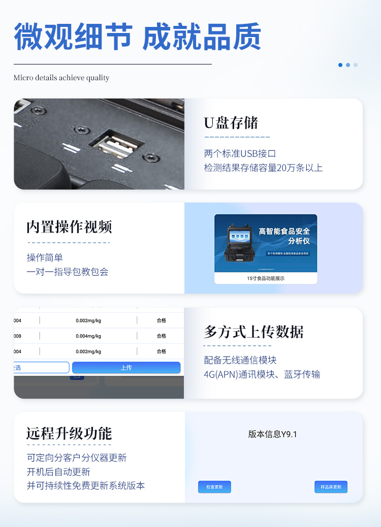 | 儀器采用手提一體化系統(tǒng)檢測(cè)技術(shù),將分光光度模塊、膠體金檢測(cè)模塊、新型農(nóng)殘檢測(cè)模塊、數(shù)字化管理模塊、無(wú)線通訊模塊高度集成于一體,支持檢測(cè)200種食品安全檢測(cè)項(xiàng)目,同時(shí)預(yù)留升級(jí)檢測(cè)方法。 | 儀器檢測(cè)模塊標(biāo)準(zhǔn)化、智能化,檢測(cè)項(xiàng)目可隨意自由組合。檢測(cè)箱體內(nèi)置多個(gè)標(biāo)準(zhǔn)檢測(cè)單元,檢測(cè)模塊可以調(diào)整配置。 | 顯示屏幕:儀器采用10.1英寸豎向液晶觸摸屏顯,搭配運(yùn)行安卓智能操作系統(tǒng),主控芯片采用ARM Cortex-A7,RK3288/4核處理器,主頻1.88Ghz,操作方便,性能更強(qiáng)。 | 檢測(cè)通道:≥12通道;采用精密旋轉(zhuǎn)比色池設(shè)計(jì),使用同芯片同光源校準(zhǔn)精度,解決不同光源之間的誤差值,更加準(zhǔn)確**。(1-12通道間誤差0.1%,**號(hào):ZL202022821055.2) | 儀器光源:高精度進(jìn)口四波長(zhǎng)冷光源,每個(gè)通道均配置 410、520、590、630nm 波長(zhǎng)光源,標(biāo)配**的光路切換裝置,**光路切換功能可實(shí)現(xiàn)64波長(zhǎng),并且所有檢測(cè)項(xiàng)目可實(shí)現(xiàn)所有通道同時(shí)檢測(cè)。 | 設(shè)備可一鍵校準(zhǔn),自動(dòng)保存校準(zhǔn)數(shù)據(jù),自動(dòng)對(duì)比校驗(yàn),得到精準(zhǔn)光源,采用Android SP存儲(chǔ)數(shù)據(jù),光源數(shù)據(jù)永不丟失,方便每一次使用。 | 通訊接口:配備無(wú)線通信模塊、4G(APN)通訊模塊、藍(lán)牙傳輸,同時(shí)具有雙USB接口以及RJ45網(wǎng)線接口,可以多方式實(shí)現(xiàn)數(shù)據(jù)保存及數(shù)據(jù)傳輸。 | 存儲(chǔ)方式:支持U盤(pán)存儲(chǔ),標(biāo)準(zhǔn)USB接口,免驅(qū)動(dòng)安裝。檢測(cè)結(jié)果存儲(chǔ)容量20萬(wàn)條以上,可生成Excel表格進(jìn)行拷貝,并具有登錄保護(hù)功能。 | 智能化操作系統(tǒng):: ★操作系統(tǒng):儀器可在同一檢測(cè)界面自動(dòng)對(duì)應(yīng)相關(guān)檢測(cè)通道,一次性選擇1-12個(gè)樣品名稱,無(wú)需退出界面,節(jié)省操作時(shí)間。并可以對(duì)每個(gè)通道屬性和樣品信息單獨(dú)進(jìn)行編輯,例如送檢單位、人員,檢測(cè)人員等,打印時(shí)勾選打印顯示。 | ★數(shù)據(jù)集成系統(tǒng):設(shè)備首頁(yè)自動(dòng)匯總分析檢測(cè)數(shù)據(jù),包含:周檢測(cè)數(shù)據(jù)、月檢測(cè)數(shù)據(jù),全部檢測(cè)總數(shù)量,均包含檢測(cè)總數(shù),合格數(shù),不合格數(shù),以及相關(guān)柱形分析圖,各項(xiàng)檢測(cè)數(shù)據(jù)一目了然,無(wú)需電腦查詢,更加快捷直觀。 | ★數(shù)據(jù)庫(kù)系統(tǒng):十幾項(xiàng)數(shù)據(jù)庫(kù)分類管理儀器:包含項(xiàng)目類型、項(xiàng)目數(shù)據(jù)、檢測(cè)數(shù)據(jù)、歷史記錄、國(guó)標(biāo)信息、曲線信息、采樣信息、檢測(cè)信息、受檢信息、復(fù)核信息、圖表信息、光源校準(zhǔn)信息、打印樣式信息、樣品庫(kù)信息等等,數(shù)據(jù)庫(kù)之間互相協(xié)調(diào)聯(lián)動(dòng)保證數(shù)據(jù)的真實(shí)完整性。同時(shí)產(chǎn)品數(shù)據(jù)庫(kù)以及歷史檢測(cè)記錄支持一鍵檢索功能。 | ★限量規(guī)判系統(tǒng):具有限量查詢、添加物質(zhì)合規(guī)判定系統(tǒng)。檢測(cè)出結(jié)果后,系統(tǒng)自動(dòng)調(diào)用系統(tǒng)數(shù)據(jù)庫(kù)中相關(guān)國(guó)標(biāo)進(jìn)行比對(duì)判定,客觀顯示判定結(jié)果是否合格 | ★項(xiàng)目預(yù)設(shè)系統(tǒng):儀器具有任務(wù)預(yù)設(shè)模塊,一鍵提前預(yù)設(shè),給出方便快捷的新檢測(cè)方案,每一個(gè)任務(wù)分別可以設(shè)置不同的樣品、批次、編號(hào)、來(lái)源、備注、抽樣信息、檢測(cè)信息、受檢信息、復(fù)核信息等更多信息。樣品送檢時(shí)一鍵調(diào)取保存信息,并可多次調(diào)取,大大提高檢測(cè)效率。 | ★數(shù)據(jù)監(jiān)管系統(tǒng):同步對(duì)接監(jiān)管平臺(tái),數(shù)據(jù)可局域網(wǎng)和互聯(lián)網(wǎng)數(shù)據(jù)上傳,檢測(cè)結(jié)果可選擇直接傳至食品安全監(jiān)管平臺(tái)。進(jìn)行區(qū)域食品安全監(jiān)管及大數(shù)據(jù)分析處理與數(shù)據(jù)統(tǒng)計(jì),檢測(cè)區(qū)域食品安全長(zhǎng)短期動(dòng)態(tài),達(dá)到食品安全問(wèn)題預(yù)估、預(yù)警。 | ★打印系統(tǒng):內(nèi)置全新打印機(jī),新創(chuàng)自定義打印方式,可按需靈活勾選控制:產(chǎn)品合格證(國(guó)家農(nóng)業(yè)部標(biāo)準(zhǔn)要求),二維碼,抽樣信息、檢測(cè)信息,受檢信息、復(fù)核信息、抽樣日期、檢測(cè)日期等信息的打印。 | 供電模式:儀器交直流兩用,直流12V供電,可連接車(chē)載電源,可配6ah大容量充電鋰電池,電量可實(shí)時(shí)顯示,方便戶外流動(dòng)測(cè)試。 | 膠體金檢測(cè)模塊:采用雙通道CMOS成像處理技術(shù)及膠體金免疫層析技術(shù),可同時(shí)讀取雙膠體金卡數(shù)據(jù),自動(dòng)采集、處理分析,將檢測(cè)結(jié)果顯示,并可根據(jù)參考限值自動(dòng)判斷檢測(cè)結(jié)果,可檢測(cè)常見(jiàn)的獸藥殘留、生物毒素、抗生素、違禁添加物等。 | ★探測(cè)技術(shù):CMOS成像探測(cè); | ★檢測(cè)通道:1個(gè)通道; | ★檢測(cè)方式:消線法和比