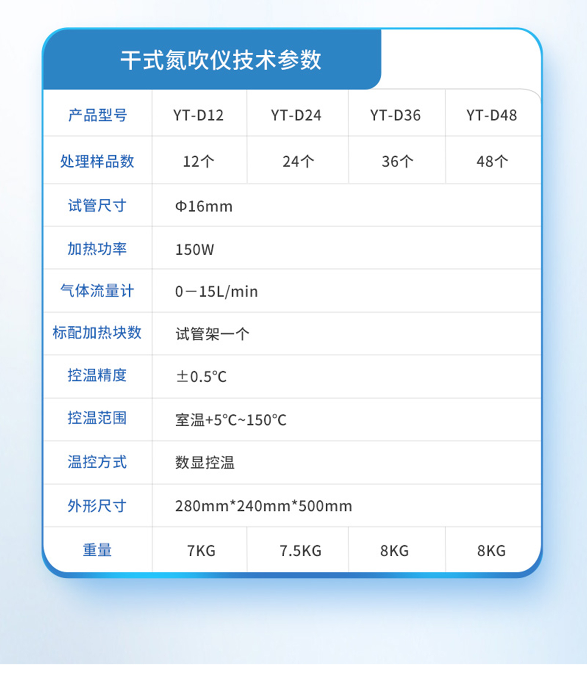 | 產(chǎn)品型號 | 處理樣品數(shù) | 孔徑尺寸 | 氮?dú)庀牧?/td> | 氣體流量計(jì) | 標(biāo)配加熱塊數(shù) | 控溫精度 | 控溫范圍 | 溫控方式 | 外形尺寸 | 功率 | 重量 |