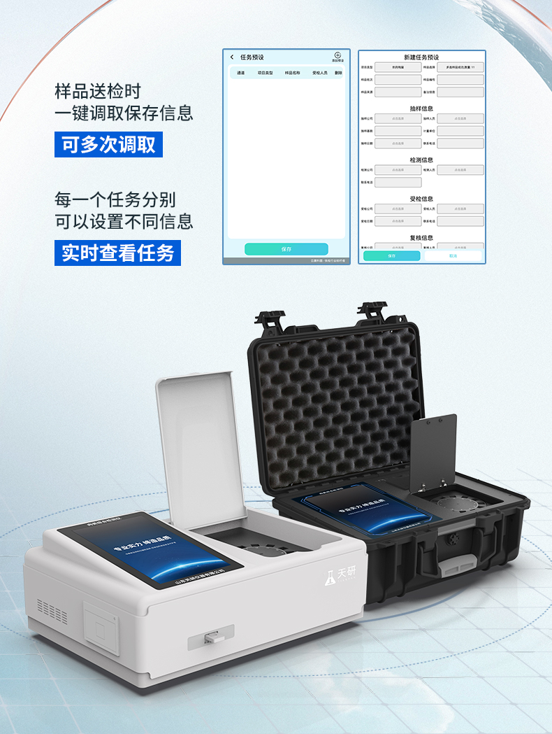 | 儀器采用臺式一體化系統(tǒng)檢測技術(shù),將分光光度模塊、膠體金檢測模塊、新型農(nóng)殘檢測模塊、數(shù)字化管理模塊、無線通訊模塊高度集成于一體,支持檢測200種食品安全檢測項目,同時預(yù)留升級檢測方法。 | 儀器檢測模塊標準化、智能化,可隨意自由組合。檢測箱體內(nèi)置多個標準檢測單元,檢測模塊可以調(diào)整配置。 | 儀器采用全新安卓智能系統(tǒng),主控芯片采用 ARM Cortex-A7,RK3288/4核處理器,10.1寸高清液晶觸摸豎屏,更加**的UI交互界面,運轉(zhuǎn)快捷;儀器配備無線通信模塊: 4G(APN)通訊模塊、Wifi模塊,藍牙傳輸,同時具有雙USB接口以及RJ45接口能以多種方式實現(xiàn)數(shù)據(jù)保存和數(shù)據(jù)傳輸功能。 | 創(chuàng)新檢測模式: | ★檢測通道:≥12通道;采用精密旋轉(zhuǎn)比色池設(shè)計,使用同芯片同光源校準精度,解決不同光源之間的誤差值。1-12通道間誤差0.1%。(**號:ZL202022821055.2) | ★儀器具有自動識別比色皿檢測功能,即:將樣品比色皿放入儀器后,點擊樣品檢測,儀器自動識別比色皿進行通道檢測。 | 進口高精光源: | 高精度進口四波長冷光源,通道配置 410、520、590、630nm 波長光源,一個光源芯片驅(qū)動一個光源,誤差極小,每臺設(shè)備單獨**校準光源,**比對,同時參照四種不同波段光源全方位覆蓋市面上99%的農(nóng)殘食品項目檢測。 | 膠體金模塊檢測方式: | 采用COMS實時成像技術(shù),可采集多個畫面,支持3個金標同時讀卡,通過不同顏色的灰度變化,一秒精準得出結(jié)果。 | 智能化操作系統(tǒng): | 便捷操作系統(tǒng):設(shè)備檢測時可在同一檢測界面自動對應(yīng)相關(guān)檢測通道一次性選擇1-12個樣品名稱,無須退出界面,節(jié)省操作時間。 | 數(shù)據(jù)集成系統(tǒng):設(shè)備首頁自動統(tǒng)計檢測數(shù)據(jù)包含:周檢測數(shù)據(jù)、月檢測數(shù)據(jù),全部檢測總數(shù)量,均包含檢測總數(shù),合格數(shù),不合格數(shù),以及相關(guān)柱形分析圖,對各項檢測數(shù)據(jù)清晰掌握,無需電腦查詢,更加快捷直觀。 | 項目預(yù)設(shè)系統(tǒng):支持添加單個及多個相同或不相同的任務(wù)預(yù)設(shè),一鍵快速調(diào)取,每一個任務(wù)分別可以設(shè)置不同的樣品、批次、編號、來源、備注、抽樣信息、檢測信息、受檢信息、復(fù)核信息等更多信息。無縫鏈接平臺和APP實時查看下發(fā)任務(wù)。 | 數(shù)據(jù)監(jiān)管系統(tǒng):同步對接監(jiān)管平臺,數(shù)據(jù)可局域網(wǎng)和互聯(lián)網(wǎng)數(shù)據(jù)上傳,檢測結(jié)果可選擇直接傳至食品安全監(jiān)管平臺。集成OSS輸出存儲服務(wù)、區(qū)分設(shè)備定向管理應(yīng)用,進行區(qū)域食品安全監(jiān)管及大數(shù)據(jù)分析處理與數(shù)據(jù)統(tǒng)計,檢測區(qū)域食品安全長短期動態(tài),達到食品安全問題預(yù)估、預(yù)警。 | 自定義打印系統(tǒng):內(nèi)置全新打印系統(tǒng),新創(chuàng)自定義打印方式,可按需靈活設(shè)置開啟或關(guān)閉:產(chǎn)品合格證(國家農(nóng)業(yè)部標準要求),二維碼,抽樣信息、檢測信息,受檢信息、復(fù)核信息、抽樣日期、檢測日期等信息的打印。 | 系統(tǒng)遠程更新功能:可定向分客戶分儀器更新系統(tǒng),按照不同客戶后期實際需求添加項目,無需機器返廠,即可遠程實時升級全新系統(tǒng),節(jié)省時間成本及避免運輸造成設(shè)備損壞。 | 儀器主機采用一體化防水、抗壓、防撞擊、防腐蝕箱體設(shè)計,同時配備交直流供電,可連接車載電源,可選配大容量充電鋰電池,滿足現(xiàn)場野外檢測需求。 | 安全證書,放心保障:儀器具有中國計量科學研究院校準證書,**認證。 |