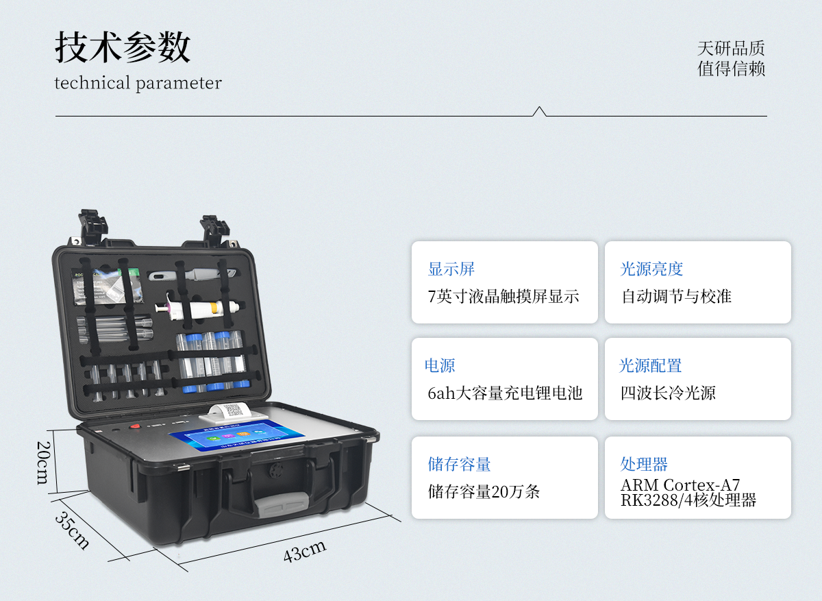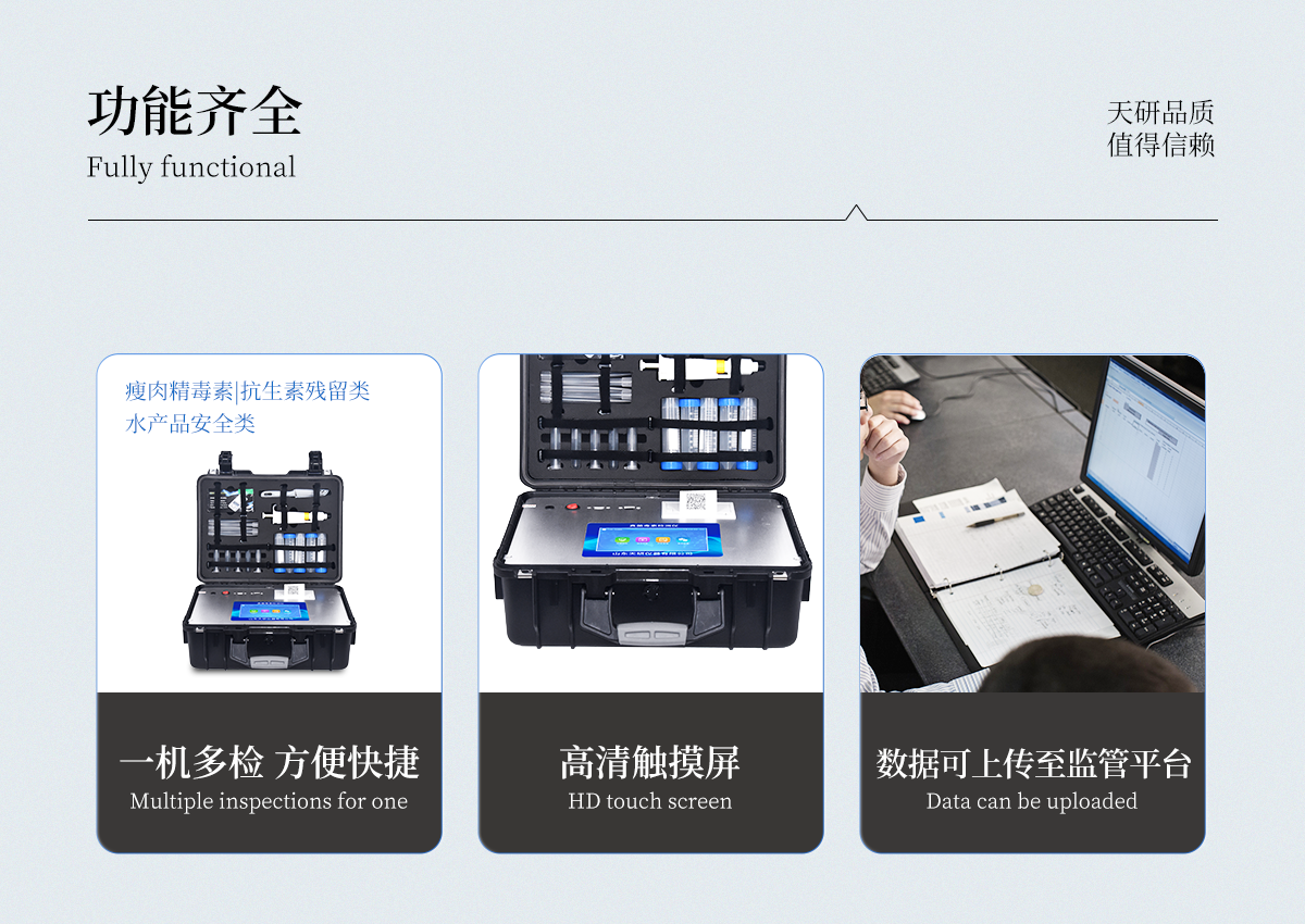 | 用途:可用于糧食谷物及其制品、飼料、植物油中真菌毒素快速定量測定; | 檢測方法:采用發(fā)光定量免疫層析技術,激光激發(fā),掃描方式收集發(fā)光熒光信號。 | 定量參數設定:RFID芯片記錄檢測目標的標準曲線,根據不同樣本類型配備多參數卡; | 識別功能:試劑插卡后儀器自動識別檢測項目; | 靈敏性和特異性:不受外界的背景干擾, 檢測限為0.4-4500ug/kg;對其它毒素無非特異反應; | 穩(wěn)定性:無淬滅和光漂白現象; | 檢測時間快,實時顯示檢測曲線 | 無需孵育器,室溫(15-30℃)下進行測試 | 數據獲取和處理:檢測結果自動獲取(無需目測),可實時打印檢測報告;數據可儲存,可導出。 | 儀器可靠:有開機系統(tǒng)自檢功能;儀器配有質控卡,確保檢測系統(tǒng)自身的準確性; | 檢測數據精準可靠:HPLC/LC-MS結果接近 | 檢測儀器獲得國家認證 | 聯網:網絡接口 | 升級:可以通過U盤進行軟件升級 | 存儲空間:≥32G,**擴展至64G | 工作功率:40W | 操作系統(tǒng):windows 7 | 顯示屏:可觸摸顯示屏,屏幕尺寸≥8寸 | 定量檢測項目:包括黃曲霉毒素B1、嘔吐毒素、玉米赤霉烯酮、T-2毒素、伏馬毒素 |