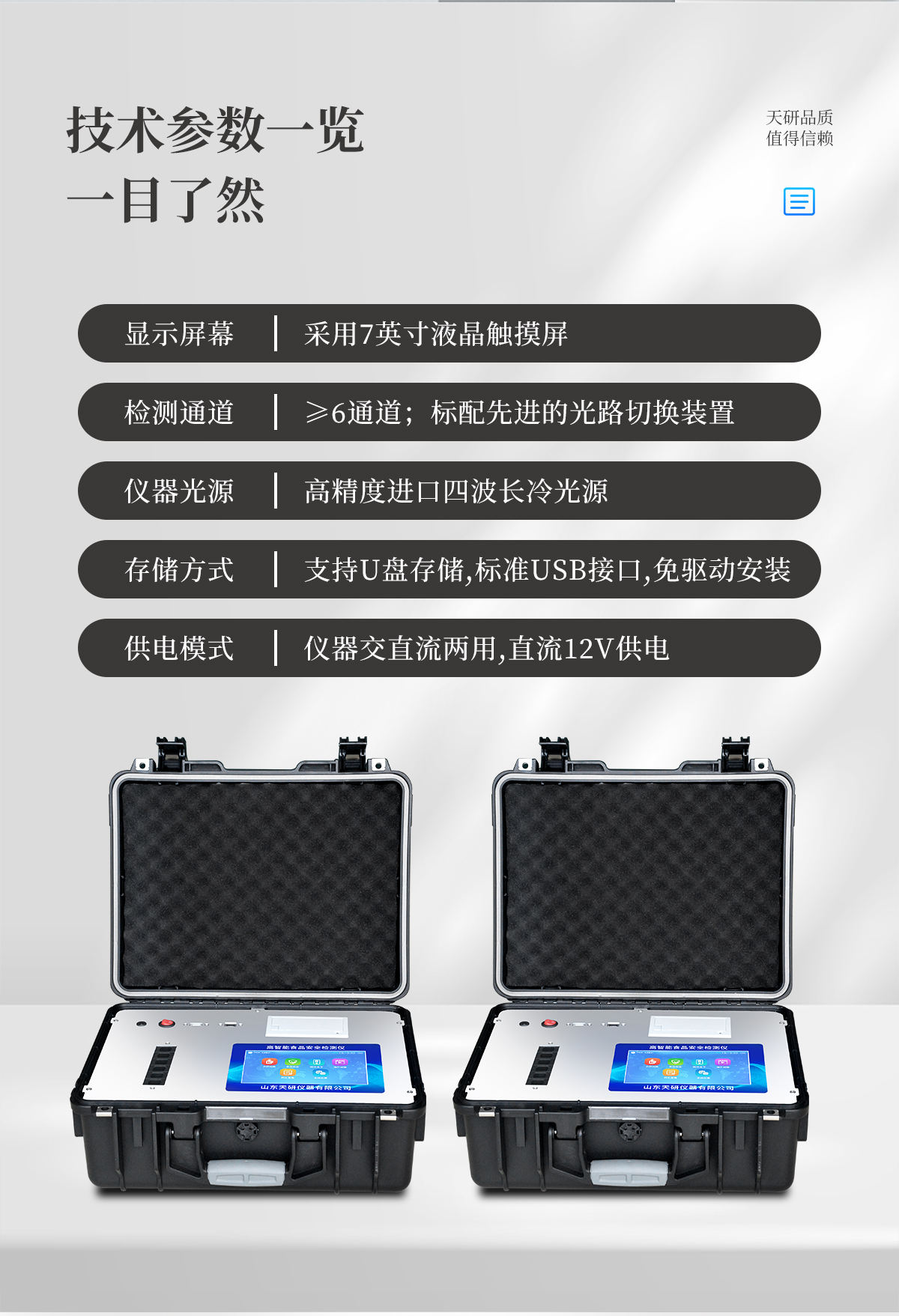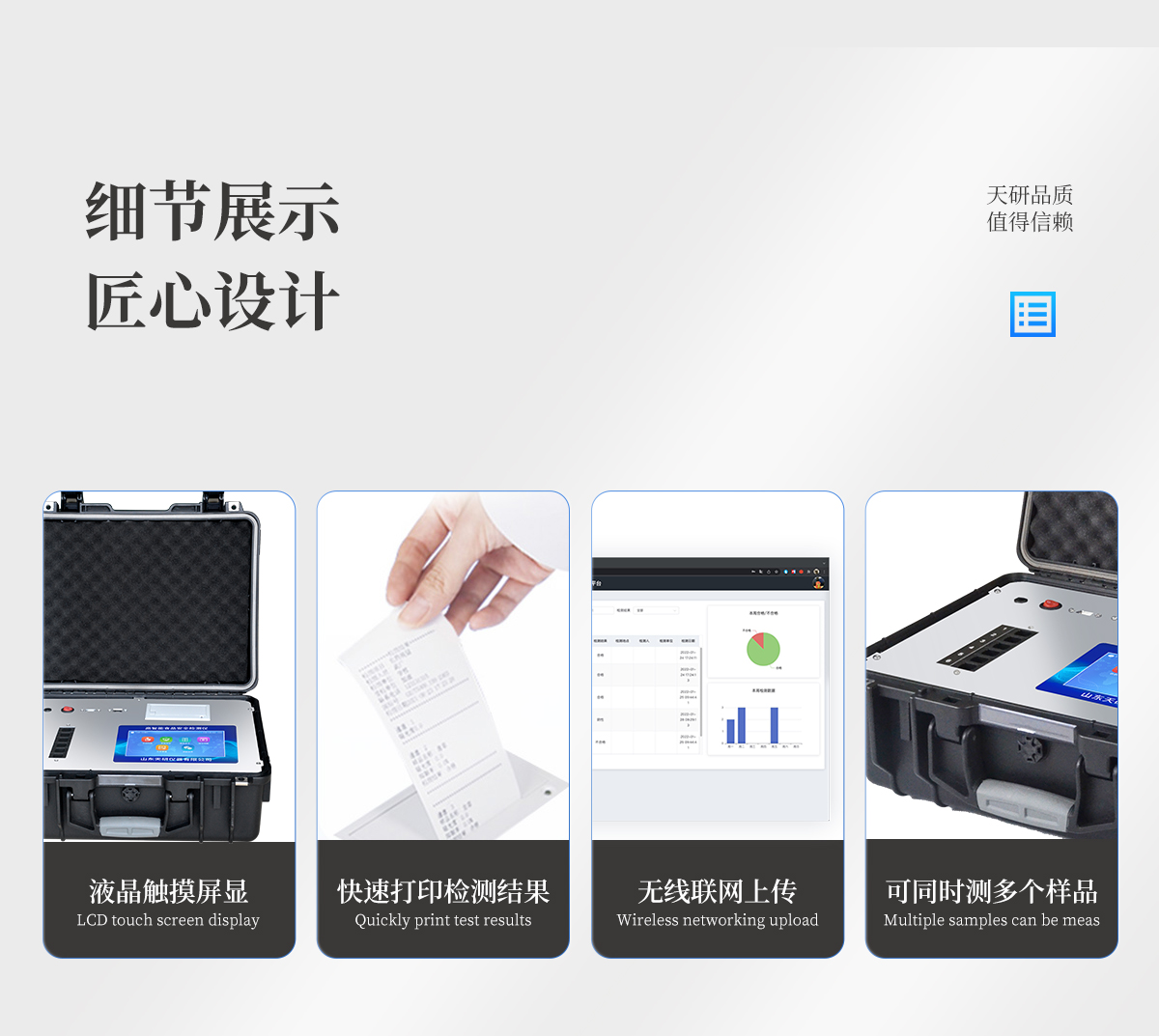 | 儀器采用手提式一體化系統(tǒng)檢測(cè)技術(shù),將分光光度模塊、新型農(nóng)殘檢測(cè)模塊、數(shù)字化管理模塊、無(wú)線通訊模塊高度集成于一體,支持檢測(cè)200種食品安全檢測(cè)項(xiàng)目,同時(shí)預(yù)留升級(jí)檢測(cè)方法。 | 儀器檢測(cè)模塊標(biāo)準(zhǔn)化、智能化,檢測(cè)項(xiàng)目可隨意自由組合。檢測(cè)箱體內(nèi)置多個(gè)標(biāo)準(zhǔn)檢測(cè)單元,檢測(cè)模塊可以調(diào)整配置。 | 顯示屏幕:儀器采用10.1英寸豎向液晶觸摸屏顯,搭配運(yùn)行安卓智能操作系統(tǒng),主控芯片采用ARM Cortex-A7,RK3288/4核處理器,主頻1.88Ghz,操作方便,性能更強(qiáng)。 | 檢測(cè)通道:≥12通道;采用精密旋轉(zhuǎn)比色池設(shè)計(jì),使用同芯片同光源校準(zhǔn)精度,解決不同光源之間的誤差值,更加準(zhǔn)確**。(1-12通道間誤差0.1%,**號(hào):ZL202022821055.2) | 儀器光源:高精度進(jìn)口四波長(zhǎng)冷光源,每個(gè)通道均配置 410、520、590、630nm 波長(zhǎng)光源,標(biāo)配**的光路切換裝置,**光路切換功能可實(shí)現(xiàn)64波長(zhǎng),并且所有檢測(cè)項(xiàng)目可實(shí)現(xiàn)所有通道同時(shí)檢測(cè)。 | 設(shè)備可一鍵校準(zhǔn),自動(dòng)保存校準(zhǔn)數(shù)據(jù),自動(dòng)對(duì)比校驗(yàn),得到精準(zhǔn)光源,采用Android SP存儲(chǔ)數(shù)據(jù),光源數(shù)據(jù)永不丟失,方便每一次使用。 | 通訊接口:配備無(wú)線通信模塊、4G(APN)通訊模塊、藍(lán)牙傳輸,同時(shí)具有雙USB接口以及RJ45網(wǎng)線接口,可以多方式實(shí)現(xiàn)數(shù)據(jù)保存及數(shù)據(jù)傳輸 | 存儲(chǔ)方式:支持U盤存儲(chǔ),標(biāo)準(zhǔn)USB接口,免驅(qū)動(dòng)安裝。檢測(cè)結(jié)果存儲(chǔ)容量20萬(wàn)條以上,可生成Excel表格進(jìn)行拷貝,并具有登錄保護(hù)功能。 | 智能化操作系統(tǒng): | 1)操作系統(tǒng):儀器可在同一檢測(cè)界面自動(dòng)對(duì)應(yīng)相關(guān)檢測(cè)通道,一次性選擇1-12個(gè)樣品名稱,無(wú)需退出界面,節(jié)省操作時(shí)間。并可以對(duì)每個(gè)通道屬性和樣品信息單獨(dú)進(jìn)行編輯,例如送檢單位、人員,檢測(cè)人員等,打印時(shí)勾選打印顯示。 | 2)數(shù)據(jù)集成系統(tǒng):設(shè)備首頁(yè)自動(dòng)匯總分析檢測(cè)數(shù)據(jù),包含:周檢測(cè)數(shù)據(jù)、月檢測(cè)數(shù)據(jù),全部檢測(cè)總數(shù)量,均包含檢測(cè)總數(shù),合格數(shù),不合格數(shù),以及相關(guān)柱形分析圖,各項(xiàng)檢測(cè)數(shù)據(jù)一目了然,無(wú)需電腦查詢,更加快捷直觀。 | 3)數(shù)據(jù)庫(kù)系統(tǒng):十幾項(xiàng)數(shù)據(jù)庫(kù)分類管理儀器:包含項(xiàng)目類型、項(xiàng)目數(shù)據(jù)、檢測(cè)數(shù)據(jù)、歷史記錄、國(guó)標(biāo)信息、曲線信息、采樣信息、檢測(cè)信息、受檢信息、復(fù)核信息、圖表信息、光源校準(zhǔn)信息、打印樣式信息、樣品庫(kù)信息等等,數(shù)據(jù)庫(kù)之間互相協(xié)調(diào)聯(lián)動(dòng)保證數(shù)據(jù)的真實(shí)完整性。同時(shí)產(chǎn)品數(shù)據(jù)庫(kù)以及歷史檢測(cè)記錄支持一鍵檢索功能。 | 4)限量規(guī)判系統(tǒng):具有限量查詢、添加物質(zhì)合規(guī)判定系統(tǒng)。檢測(cè)出結(jié)果后,系統(tǒng)自動(dòng)調(diào)用系統(tǒng)數(shù)據(jù)庫(kù)中相關(guān)國(guó)標(biāo)進(jìn)行比對(duì)判定,客觀顯示判定結(jié)果是否合格。 | 5)項(xiàng)目預(yù)設(shè)系統(tǒng):儀器具有任務(wù)預(yù)設(shè)模塊,一鍵提前預(yù)設(shè),給出方便快捷的新檢測(cè)方案,每一個(gè)任務(wù)分別可以設(shè)置不同的樣品、批次、編號(hào)、來(lái)源、備注、抽樣信息、檢測(cè)信息、受檢信息、復(fù)核信息等更多信息。樣品送檢時(shí)一鍵調(diào)取保存信息,并可多次調(diào)取,大大提高檢測(cè)效率。 | 6)數(shù)據(jù)監(jiān)管系統(tǒng):同步對(duì)接監(jiān)管平臺(tái),數(shù)據(jù)可局域網(wǎng)和互聯(lián)網(wǎng)數(shù)據(jù)上傳,檢測(cè)結(jié)果可選擇直接傳至食品安全監(jiān)管平臺(tái)。進(jìn)行區(qū)域食品安全監(jiān)管及大數(shù)據(jù)分析處理與數(shù)據(jù)統(tǒng)計(jì),檢測(cè)區(qū)域食品安全長(zhǎng)短期動(dòng)態(tài),達(dá)到食品安全問(wèn)題預(yù)估、預(yù)警。 | 7)打印系統(tǒng):內(nèi)置全新打印機(jī),新創(chuàng)自定義打印方式,可按需靈活勾選控制:產(chǎn)品合格證(國(guó)家農(nóng)業(yè)部標(biāo)準(zhǔn)要求),二維碼,抽樣信息、檢測(cè)信息,受檢信息、復(fù)核信息、抽樣日期、檢測(cè)日期等信息的打印。 | 供電模式:儀器交直流兩用,直流12V供電,可連接車載電源,可配6ah大容量充電鋰電池,電量可實(shí)時(shí)顯示,方便戶外流動(dòng)測(cè)試。 | 膠體金檢測(cè)模塊:采用雙通道CMOS成像處理技術(shù)及膠體金免疫層析技術(shù),可同時(shí)讀取雙膠體金卡數(shù)據(jù),自動(dòng)采集、處理分析,將檢測(cè)結(jié)果顯示,并可根據(jù)參考限值自動(dòng)判斷檢測(cè)結(jié)果,可檢測(cè)常見(jiàn)的獸藥殘留、生物毒素、抗生素、違禁添加物等。 | 1)探測(cè)技術(shù):CMOS成像探測(cè); | 2)檢測(cè)通道:1個(gè)通道; | 3)檢測(cè)方式:消線法和比色法; | 4)顯示模式:陰性或陽(yáng)性; 