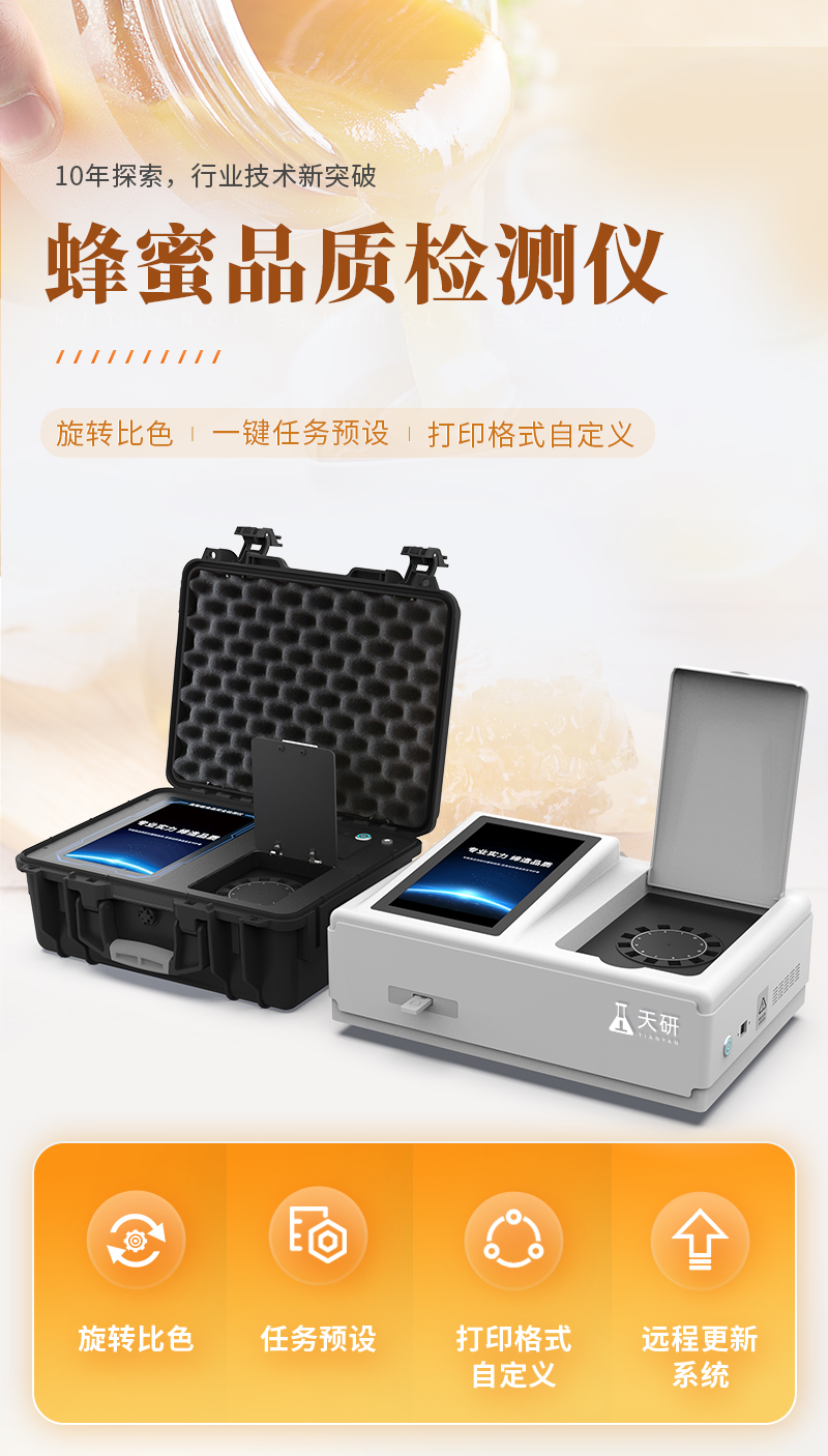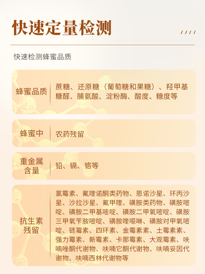 檢測項目:蜂蜜蔗糖、蜂蜜還原糖(葡萄糖和果糖)、蜂蜜羥甲基糠醛、蜂蜜酸度、蜂蜜中農(nóng)藥殘留、蜂蜜淀粉酶值、蜂蜜中脯氨酸、蜂蜜水分、蜂蜜糖分、蜂蜜中重金屬(鉛、鎘、汞)、蜂蜜中抗生素(氯霉素、四環(huán)素、磺胺類、呋喃類、喹諾酮類)、蜂蜜中灰分,應(yīng)用范圍:應(yīng)用于現(xiàn)場檢測蜂蜜蔗糖、葡萄糖和果糖、羥甲基糠醛、酸度、農(nóng)殘、淀粉酶、脯氨酸、水分、糖分、重金屬、抗生素、灰分含量的蜂蜜快速檢測儀,可廣泛應(yīng)用于各類蜂蜜品質(zhì)的快速定量檢測。