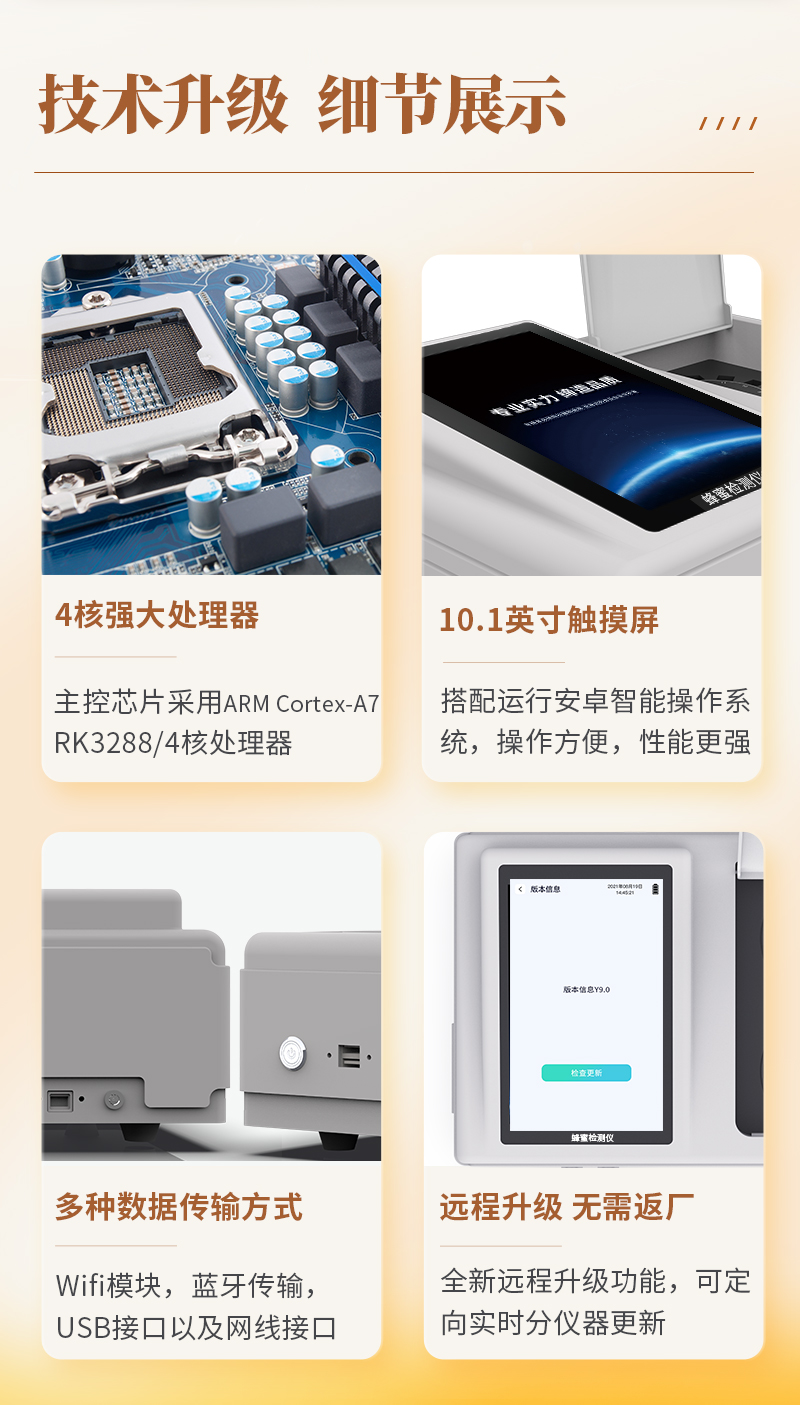 | 儀器采用手提式一體化系統(tǒng)檢測技術(shù),將分光光度模塊、膠體金檢測模塊、新型農(nóng)殘檢測模塊、數(shù)字化管理模塊、無線通訊模塊高度集成于一體,支持檢測200種食品安全檢測項目,同時預(yù)留升級檢測方法。 | 儀器檢測模塊標準化、智能化,可隨意自由組合。檢測箱體內(nèi)置多個標準檢測單元,檢測模塊可以調(diào)整配置。 | 儀器采用全新安卓智能系統(tǒng),主控芯片采用 ARM Cortex-A7,RK3288/4核處理器,10.1寸高清液晶觸摸豎屏,更加**的UI交互界面,運轉(zhuǎn)快捷;儀器配備無線通信模塊: 4G(APN)通訊模塊、Wifi模塊,藍牙傳輸,同時具有雙USB接口以及RJ45接口能以多種方式實現(xiàn)數(shù)據(jù)保存和數(shù)據(jù)傳輸功能。 | 創(chuàng)新檢測模式:★檢測通道:≥12通道;采用精密旋轉(zhuǎn)比色池設(shè)計,使用同芯片同光源校準精度,解決不同光源之間的誤差值。1-12通道間誤差0.1%。(**號:ZL202022821055.2) | ★儀器具有自動識別比色皿檢測功能,即:將樣品比色皿放入儀器后,點擊樣品檢測,儀器自動識別比色皿進行通道檢測。 | 進口高精光源: | 高精度進口四波長冷光源,通道配置 410、520、590、630nm 波長光源,一個光源芯片驅(qū)動一個光源,誤差極小,每臺設(shè)備單獨**校準光源,**比對,同時參照四種不同波段光源全方位覆蓋市面上99%的農(nóng)殘食品項目檢測。 | 膠體金模塊檢測方式:★采用COMS實時成像技術(shù),單金標實時讀卡,通過不同顏色的灰度變化,一秒精準得出結(jié)果。 | 智能操作分析系統(tǒng):★便捷操作系統(tǒng):設(shè)備檢測時可在同一檢測界面自動對應(yīng)相關(guān)檢測通道一次性選擇1-12個樣品名稱,無須退出界面,節(jié)省操作時間。 | ★數(shù)據(jù)集成系統(tǒng):設(shè)備首頁自動統(tǒng)計檢測數(shù)據(jù)包含:周檢測數(shù)據(jù)、月檢測數(shù)據(jù),全部檢測總數(shù)量,均包含檢測總數(shù),合格數(shù),不合格數(shù),以及相關(guān)柱形分析圖,對各項檢測數(shù)據(jù)清晰掌握,無需電腦查詢,更加快捷直觀。 | ★項目預(yù)設(shè)系統(tǒng):支持添加單個及多個相同或不相同的任務(wù)預(yù)設(shè),一鍵快速調(diào)取,每一個任務(wù)分別可以設(shè)置不同的樣品、批次、編號、來源、備注、抽樣信息、檢測信息、受檢信息、復(fù)核信息等更多信息。無縫鏈接平臺和APP實時查看下發(fā)任務(wù)。 | ★數(shù)據(jù)監(jiān)管系統(tǒng):同步對接監(jiān)管平臺,數(shù)據(jù)可局域網(wǎng)和互聯(lián)網(wǎng)數(shù)據(jù)上傳,檢測結(jié)果可選擇直接傳至食品安全監(jiān)管平臺。集成OSS輸出存儲服務(wù)、區(qū)分設(shè)備定向管理應(yīng)用,進行區(qū)域食品安全監(jiān)管及大數(shù)據(jù)分析處理與數(shù)據(jù)統(tǒng)計,檢測區(qū)域食品安全長短期動態(tài),達到食品安全問題預(yù)估、預(yù)警。 | ★自定義打印系統(tǒng):內(nèi)置全新打印系統(tǒng),新創(chuàng)自定義打印方式,可按需靈活設(shè)置開啟或關(guān)閉:產(chǎn)品合格證(國家農(nóng)業(yè)部標準要求),二維碼,抽樣信息、檢測信息,受檢信息、復(fù)核信息、抽樣日期、檢測日期等信息的打印。 | ★系統(tǒng)遠程更新功能:可定向分客戶分儀器更新系統(tǒng),按照不同客戶后期實際需求添加項目,無需機器返廠,即可遠程實時升級全新系統(tǒng),節(jié)省時間成本及避免運輸造成設(shè)備損壞。 | 儀器主機采用一體化防水、抗壓、防撞擊、防腐蝕箱體設(shè)計,同時配備交直流供電,可連接車載電源,可選配大容量充電鋰電池,滿足現(xiàn)場野外檢測需求。 | 安全證書,放心保障:儀器具有中國計量科學(xué)研究院校準證書,**認證。 |