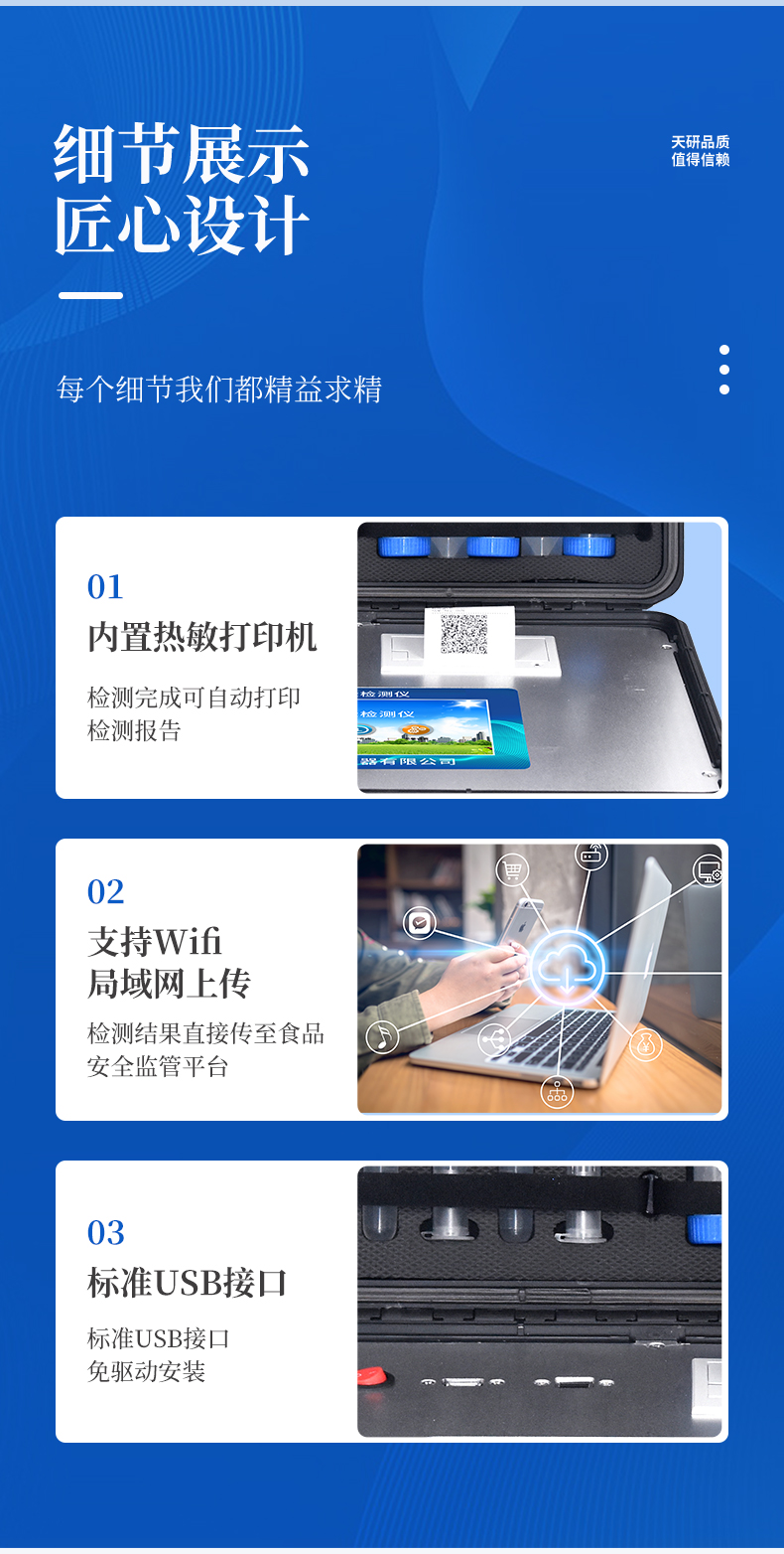 | 安卓智能操作系統(tǒng),采用更加**UI交互界面,儀器具有wifi聯(lián)網(wǎng)上傳、4G聯(lián)網(wǎng)傳輸、GPRS無線遠(yuǎn)傳、網(wǎng)線連接功能,快速批量上傳數(shù)據(jù)。 | 智能化程度高,儀器具有自檢功能:具有開機(jī)自檢和調(diào)零功能,具有自動檢測重復(fù)性功能。 | 新一代高速熱敏打印機(jī),檢測完成可自動打印檢測報告和二維碼。 | 儀器帶有監(jiān)管平臺,數(shù)據(jù)可局域網(wǎng)和互聯(lián)網(wǎng)數(shù)據(jù)上傳,檢測結(jié)果直接傳至食品安全監(jiān)管平臺。進(jìn)行區(qū)域食品安全監(jiān)管及大數(shù)據(jù)分析處理與數(shù)據(jù)統(tǒng)計,檢測區(qū)域食品安全長短期動態(tài),達(dá)到食品安全問題預(yù)估、預(yù)警 | 一體化便攜式快檢設(shè)備,滿足現(xiàn)場及流動檢測使用需求,能夠在同一軟件下實現(xiàn)所有檢測項目的檢測,并可通過同一窗口直觀顯示檢測結(jié)果。 | 膠體金模塊檢測方式:軌道式自動傳輸掃描,檢測完成后自動退出檢測卡。 | 一體化主機(jī),包含食品安全檢測模塊、多通道農(nóng)藥殘留檢測模塊、膠體金免疫層析檢測模塊。 | CT線自動識別,無需手動調(diào)整。 | 儀器具有品類多種類樣品菜單庫,可靈活選擇檢測樣品,不同的檢測通道可同時檢測不同的樣品項目。。 | 樣品處理簡單省力,整體操作快速、安全、便捷。 | 儀器具有自身保護(hù)功能,可設(shè)置用戶名及密碼,防止非工作人員操作等。 | 高靈敏度,高檢測精度,高重復(fù)性精度,掃描式高精度光學(xué)傳感器。 | 儀器具有重新校準(zhǔn)、鎖定、恢復(fù)出廠設(shè)置功能。 | 內(nèi)置強(qiáng)大的數(shù)據(jù)庫,可在儀器上直接選擇樣品名稱、檢測指標(biāo)、送檢單位等信息,也可在儀器上直接編輯錄入樣品名稱、檢測指標(biāo)、送檢單位等信息并保存進(jìn)樣品數(shù)據(jù)庫。 | 儀器具有重新校準(zhǔn)、鎖定、恢復(fù)出廠設(shè)置功能。 | 結(jié)果判定線可修改,對照值標(biāo)定值可保存,斷電不丟失數(shù)據(jù)。 | 兼容市場上所有的膠體金卡,使用耗材不受限制,極大增強(qiáng)用戶使用體驗。 |