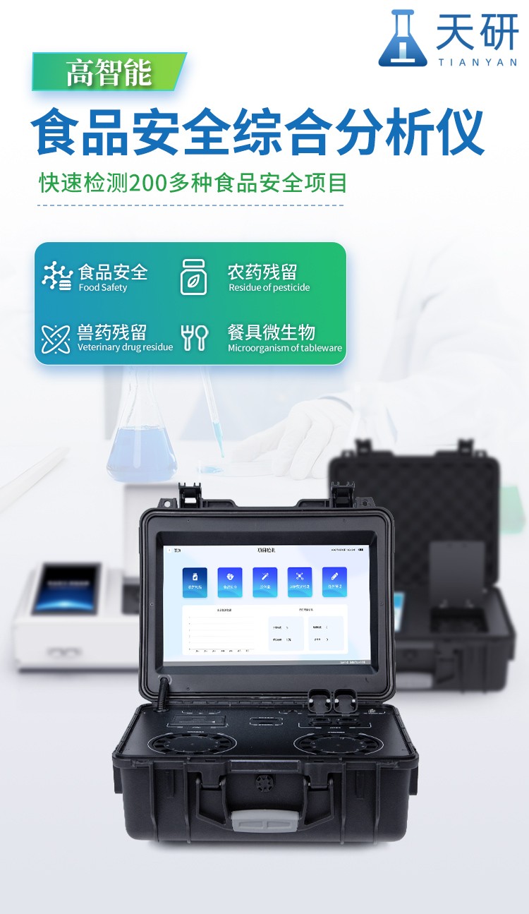 山東天研儀器有限公司生產的食品安全綜合分析儀,采用多功能集成、箱儀一體化設計,以高強度安全防護箱為載體,內部集成多個檢測功能,適用于食藥監(jiān)局、衛(wèi)生部門、高教院校、科研院所、農業(yè)農村局、食品深加工企業(yè)及檢驗檢疫部門等單位。