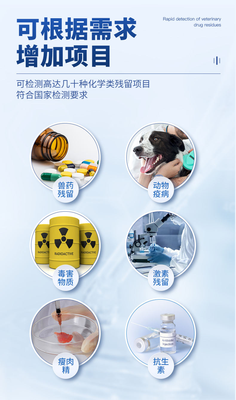 產(chǎn)品用途: 山東云唐智能科技有限公司生產(chǎn)的水產(chǎn)品安全檢測儀可適用于魚、蝦等水產(chǎn)中孔雀石綠、氯霉素、硝基呋喃類:呋喃唑酮(AOZ)、呋喃它酮( AMOZ )、呋喃妥因(AHD)、呋喃西林(SEM)、呋喃那斯、磺胺類、激素類、四環(huán)素類、金霉素、土霉素、甲砜霉素、氟苯尼考、喹諾酮類藥物:噁喹酸、諾氟沙星、恩諾沙星、