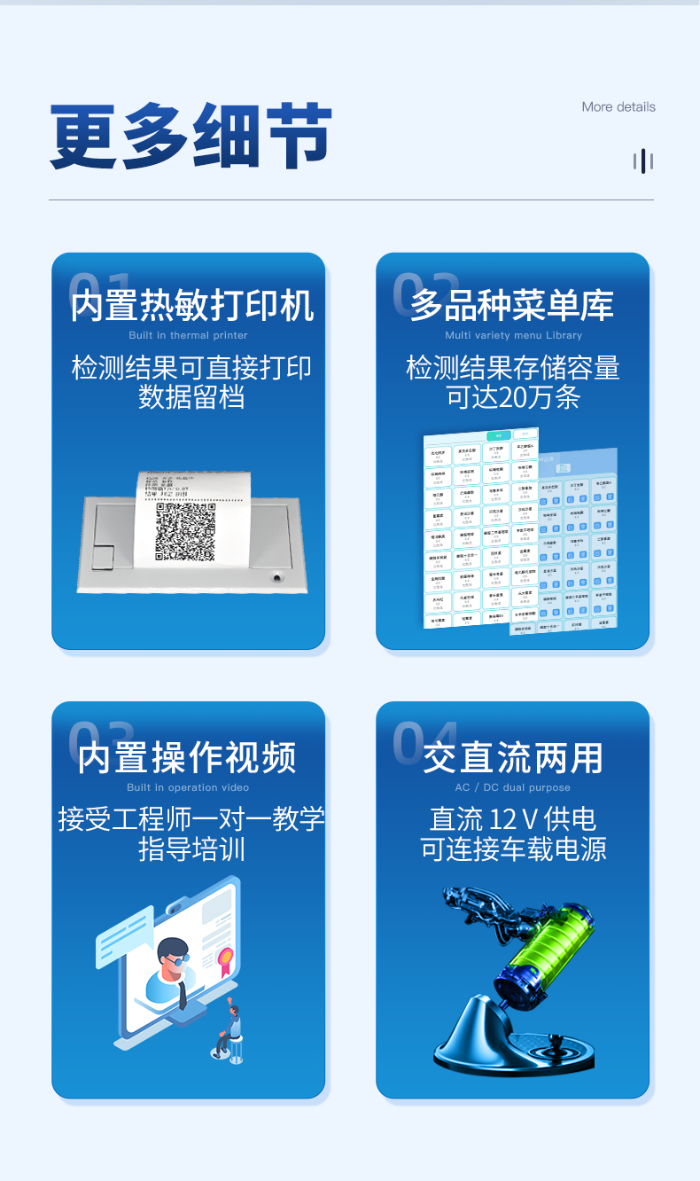 | 儀器采用10.1英寸液晶觸摸屏顯,搭配運(yùn)行安卓智能操作系統(tǒng),主控芯片采用ARM Cortex-A7,RK3288/4核處理器,主頻1.88Ghz,運(yùn)轉(zhuǎn)速度更快速,性能更強(qiáng)。 | 儀器功能包括:膠體金檢測模塊、數(shù)字化管理模塊、無線通訊模塊等,可以滿足同一軟件下實(shí)現(xiàn)所有檢測項(xiàng)目的檢測,并在同一窗口展示檢測結(jié)果。 | 一體化便攜式快檢設(shè)備,采用交直流兩用供電方式,可連接車載電源,配備6ah大容量充電鋰電池,可以滿足現(xiàn)場及流動檢測使用的需求。儀器尺寸:43×35×20cm, 主機(jī)凈重:5.1kg | 系統(tǒng)自帶數(shù)據(jù)集成模塊,設(shè)備首頁自動統(tǒng)計(jì)檢測數(shù)據(jù)包含:周檢測數(shù)據(jù)、月檢測數(shù)據(jù),全部檢測總數(shù)量,均包含檢測總數(shù),合格數(shù),不合格數(shù),以及相關(guān)柱形分析圖,對各項(xiàng)檢測數(shù)據(jù)清晰掌握,無需電腦查詢,更加快捷直觀。 | 儀器具有任務(wù)預(yù)設(shè)模塊,可在樣品送檢前提前預(yù)設(shè)樣品名稱、檢測指標(biāo)、送檢單位等信息,樣品送檢時一鍵調(diào)取保存信息,檢測更加方便快捷。 | 膠體金檢測模塊:軌道式自動傳輸掃描方式,可實(shí)時顯示金標(biāo)卡實(shí)時圖像,系統(tǒng)自動分析并呈現(xiàn)出CT曲線圖,CT線自動識別,無需手動調(diào)整,完成檢測后自動退出檢測卡。 結(jié)果判定線可修改,對照值標(biāo)定值可保存,斷電不丟失數(shù)據(jù)。 兼容市場上其他膠體金卡,使用耗材不受限制,極大增強(qiáng)用戶使用體驗(yàn)。 | 儀器檢測系統(tǒng)擁有龐大數(shù)據(jù)庫,并且構(gòu)建了完善的檢索、修訂功能。食品庫涵蓋多種樣品名稱,可按需添加或刪除、編輯樣品名稱;產(chǎn)品數(shù)據(jù)庫以及歷史檢測記錄支持一鍵檢索功能。 | 系統(tǒng)打印自定義化,打印格式多樣化,產(chǎn)品合格證(國家標(biāo)準(zhǔn)要求),二維碼,抽樣信息、檢測信息,受檢信息、復(fù)核信息、抽樣日期、檢測日期等信息結(jié)果,可按需求自行設(shè)置打印內(nèi)容。 | A4紙版本報(bào)告打印功能(可選配):設(shè)備擁有兩種結(jié)果展示方式,可以自動生成A4打印模板和小票打印模板兩種樣式,可通過WiFi及網(wǎng)線等方式鏈接外置打印機(jī)可進(jìn)行打印 | 儀器具有 wifi 聯(lián)網(wǎng)上傳、RJ45網(wǎng)線連接功能,可以快速上傳數(shù)據(jù)。同步對接監(jiān)管平臺,數(shù)據(jù)可局域網(wǎng)和互聯(lián)網(wǎng)數(shù)據(jù)上傳,檢測結(jié)果直接傳至食品安全監(jiān)管平臺。進(jìn)行區(qū)域食品安全監(jiān)管及大數(shù)據(jù)分析處理與數(shù)據(jù)統(tǒng)計(jì),檢測區(qū)域食品安全長短期動態(tài),達(dá)到食品安全問題預(yù)估、預(yù)警。 | 設(shè)備支持U盤存儲,標(biāo)準(zhǔn)USB接口,免驅(qū)動安裝。檢測結(jié)果存儲容量20萬條以上,可生成Excel表格,進(jìn)行一鍵拷貝,并具有登錄保護(hù)功能,可設(shè)置用戶名及密碼,規(guī)范不同人員操作權(quán)限,防止非工作人員操作,并且可以進(jìn)行重新校準(zhǔn)、鎖定、恢復(fù)出廠設(shè)置功能。儀器固件可升級,后期檢測項(xiàng)目可擴(kuò)充。 | 儀器具備遠(yuǎn)程升級功能,可定向分客戶分儀器更新,開機(jī)后自動更新,并可持續(xù)性免費(fèi)更新系統(tǒng)版本,無需像傳統(tǒng)產(chǎn)品返廠更新,節(jié)省時間及人力成本并避免了物流運(yùn)輸返廠升級導(dǎo)致設(shè)備損壞的潛在風(fēng)險。 |