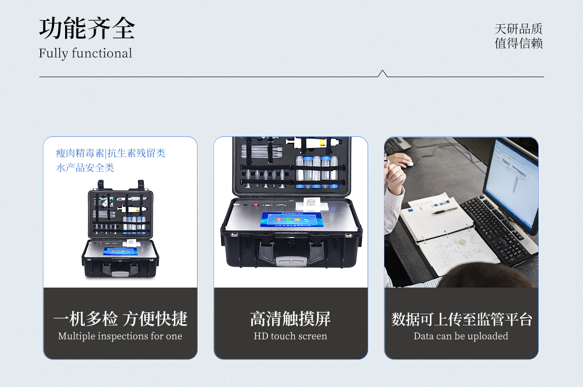 | 安卓智能操作系統(tǒng),采用更加**和人性化操作,儀器具有網(wǎng)線連接、wifi聯(lián)網(wǎng)上傳、4G無(wú)線遠(yuǎn)傳功能,快速上傳數(shù)據(jù)。 | 智能化程度高,儀器具有自檢功能:具有開(kāi)機(jī)自檢和調(diào)零功能,具有自動(dòng)檢測(cè)重復(fù)性功能。 | 新一代高速熱敏打印機(jī),檢測(cè)完成可自動(dòng)打印檢測(cè)報(bào)告和二維碼。 | 儀器帶有監(jiān)管平臺(tái)。數(shù)據(jù)可局域網(wǎng)和互聯(lián)網(wǎng)數(shù)據(jù)上傳,檢測(cè)結(jié)果直接傳至食品安全監(jiān)管平臺(tái)。進(jìn)行區(qū)域食品安全監(jiān)管及大數(shù)據(jù)分析處理與數(shù)據(jù)統(tǒng)計(jì),檢測(cè)區(qū)域食品安全長(zhǎng)短期動(dòng)態(tài),達(dá)到食品安全問(wèn)題預(yù)估、預(yù)警。 | 一體化便攜式快檢設(shè)備,滿足現(xiàn)場(chǎng)及流動(dòng)檢測(cè)使用需求,能夠在同一軟件下實(shí)現(xiàn)所有檢測(cè)項(xiàng)目的檢測(cè),并可通過(guò)同一窗口直觀顯示檢測(cè)結(jié)果。 | 膠體金模塊檢測(cè)方式:軌道式自動(dòng)傳輸掃描,檢測(cè)完成后自動(dòng)退出檢測(cè)卡。 | CT線自動(dòng)識(shí)別,無(wú)需手動(dòng)調(diào)整。 | 儀器具有品類多種類樣品菜單庫(kù),可靈活選擇檢測(cè)樣品,不同的檢測(cè)通道可同時(shí)檢測(cè)不同的樣品項(xiàng)目。 | 樣品處理簡(jiǎn)單省力,整體操作快速、安全、便捷。 | 儀器具有自身保護(hù)功能,可設(shè)置用戶名及密碼,防止非工作人員操作等。 | 高靈敏度,高檢測(cè)精度,高重復(fù)性精度,掃描式高精度光學(xué)傳感器。 | 內(nèi)置強(qiáng)大的數(shù)據(jù)庫(kù),可在儀器上直接選擇樣品名稱、檢測(cè)指標(biāo)、送檢單位等信息,也可在儀器上直接編輯錄入樣品名稱、檢測(cè)指標(biāo)、送檢單位等信息并保存進(jìn)樣品數(shù)據(jù)庫(kù)。 | 儀器具有重新校準(zhǔn)、鎖定、恢復(fù)出廠設(shè)置功能。 | 支持U盤(pán)存儲(chǔ)。 結(jié)果判定線可修改,對(duì)照值標(biāo)定值可保存,斷電不丟失數(shù)據(jù)。 | 兼容市場(chǎng)上所有的膠體金卡,使用耗材不受限制,極大增強(qiáng)用戶使用體驗(yàn)。 |