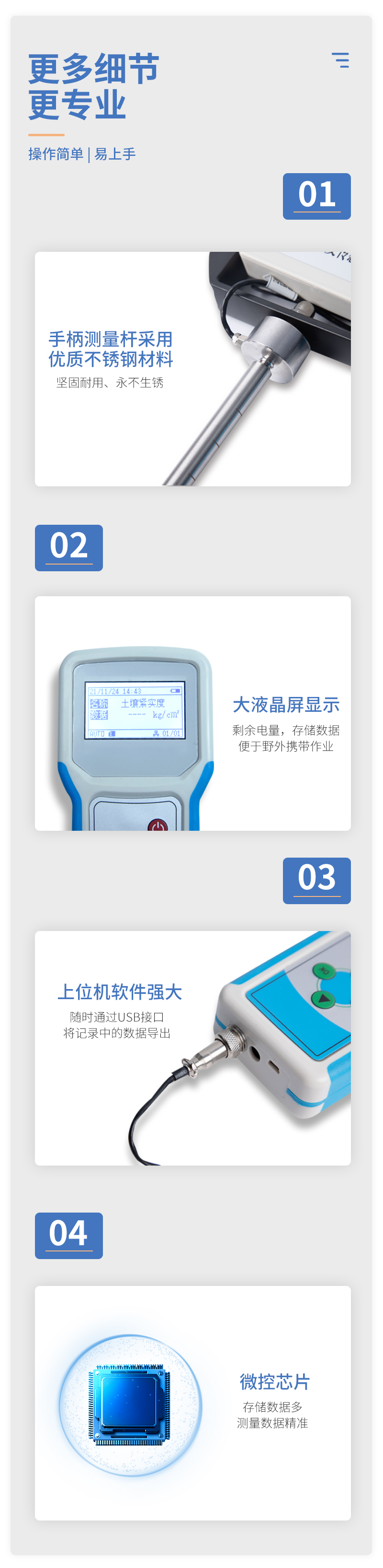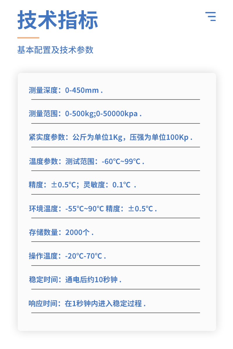 土壤緊實度由土壤抗剪力、壓縮力和摩擦力等構成。是土壤強度的一個合成指標。金屬柱塞或探針壓入土壤時分動載和靜載兩種方法,不同方法的測定值不同,但有聯(lián)系。柱塞的形狀有錐體、平頭、圓球及楔子等,這些對測定值也有影響。對同一種方法的測定值,主要決定于土壤質地、容重和含水量。其中含水量的影響**。土壤緊實度可預測土壤承載量、耕性和根系伸展的阻力。土壤緊實度的大小可影響作物根系的穿孔和生長,是一個重要的土壤物理特性指標,用于評價土壤耕性。緊實的土壤可阻止水分的入滲,降低化肥的利用率,影響植物根系生長,導致作物減產。