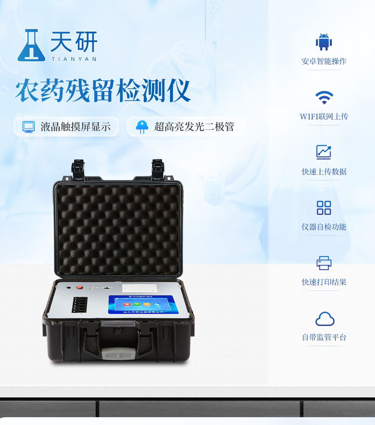 | 隨著人民生活水平的不斷提升,市場對茶葉的把控愈加嚴格。針對現(xiàn)狀,我司專門研發(fā)生產(chǎn)--茶葉專用的農(nóng)藥殘留速測儀;定位茶農(nóng)、茶商、茶葉企業(yè)使用。 此外還可用于果蔬茶生產(chǎn)基地和農(nóng)貿(mào)批發(fā)銷售市場現(xiàn)場檢測,餐館、學(xué)校、食堂、家庭果蔬加工前的安全速測等。 | 檢測通道: 6個檢測通道,可以同時測試多個樣品,每個樣品由程序控制分別獨立工作,不會互相干擾。 | 顯示方式:≥5英寸液晶觸摸屏顯示,人性化中文操作界面,讀數(shù)直觀、簡單。 | 配備嵌入式高速熱敏打印機,可選擇手動打印或者自動打印,三分鐘出打印結(jié)果。 | 光源采用進口超高亮發(fā)光二極管,具有低功耗、穩(wěn)定性強、高靈敏度,高檢測精度,高重復(fù)性精度,光源可控、響應(yīng)速度快等優(yōu)點。 | 采用標(biāo)準(zhǔn)USB接口設(shè)計,免驅(qū)動安裝,方便數(shù)據(jù)的存貯和移動,并可隨時與計算機直接相連,并且可用計算機控制儀器。實現(xiàn)數(shù)據(jù)查詢、瀏覽、分析、統(tǒng)計、打印等。 | 智能化程度高,儀器具有自檢功能:具有開機自檢和調(diào)零功能,具有自動檢測重復(fù)性功能 | 內(nèi)置強大的數(shù)據(jù)庫,可在儀器上直接選擇樣品名稱、檢測指標(biāo)、送檢單位等信息,也可在儀器上直接編輯錄入樣品名稱、檢測指標(biāo)、送檢單位等信息并保存進樣品數(shù)據(jù)庫。 | 支持Wifi網(wǎng)絡(luò),數(shù)據(jù)可局域網(wǎng)和互聯(lián)網(wǎng)數(shù)據(jù)上傳,檢測結(jié)果直接傳至食品安全監(jiān)管平臺。進行區(qū)域食品安全監(jiān)管及大數(shù)據(jù)分析處理,檢測區(qū)域食品安全長短期動態(tài),達到食品安全問題預(yù)估、預(yù)警 |