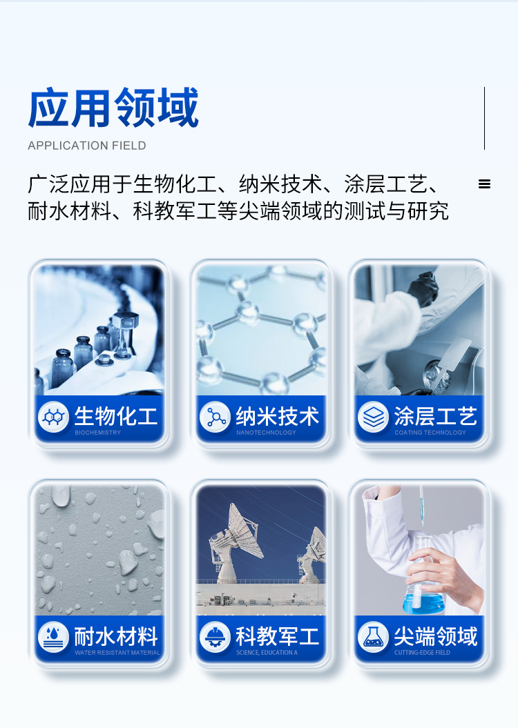 本機(jī)除了利用停滴法測(cè)試靜態(tài)接觸角外,更側(cè)重于利用傾斜板法測(cè)試和分析動(dòng)態(tài)接觸角(包括前進(jìn)接觸角、后退接觸角和滾動(dòng)角);同時(shí)也可以測(cè)試液體表面張力、估算固體表面能和分析潤(rùn)濕性。廣泛應(yīng)用于生物化工、納米技術(shù)、涂層工藝、耐水材料、科教軍工等尖端領(lǐng)域的測(cè)試與研究。
