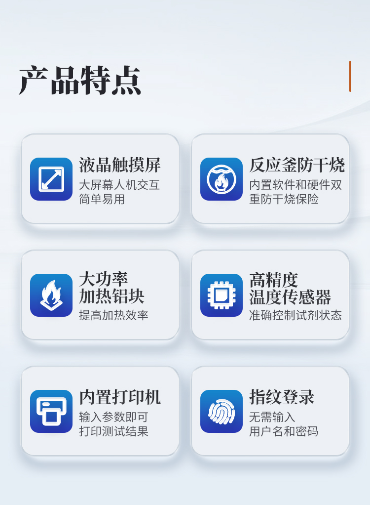 | 1. ☆采用濾袋技術(shù),濾袋孔徑25μm | 2. 耐腐蝕、耐高壓、特殊處理消煮鍋,安全可靠,經(jīng)久耐用 | 3. 彩色液晶觸摸屏,界面簡潔,操作簡單 | 4. **批處理能力,批處理能力為30個/批,效率高,節(jié)省試劑 | 5. 手動根據(jù)樣品數(shù)量添加試劑,降低使用成本 | 6. ☆**間歇攪拌技術(shù),模擬手工攪拌,使樣品處理更均勻,攪拌徹底、均勻,無試劑漏液風(fēng)險,安全可靠,攪拌速度15圈/分鐘,間歇周期1分鐘 | 7. 全面的監(jiān)控配置,包括試劑量、溫度、壓力監(jiān)測 | 8. ☆儀器采用高壓密閉測試,無需冷卻水,節(jié)水環(huán)保 | 9. 儀器可以直接在普通實驗室環(huán)境,無需通風(fēng)櫥 | 10. 儀器內(nèi)部無危險的玻璃材質(zhì)器件,安全可靠 |