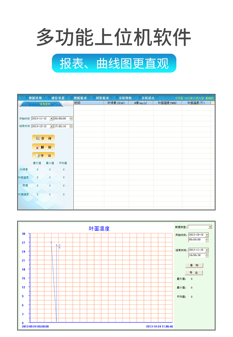 | 葉綠素測定儀TY-YB可同時測量葉綠素、葉面溫度兩個參數(shù),帶上位機(jī)軟件功能,數(shù)據(jù)可導(dǎo)出。 | 快速無損植物活體檢測,不影響植物成長。 | 一次操作可同時測定所有參數(shù),實時顯示,且可同時儲存 | 歷史數(shù)據(jù)查看,即可順序查看,也可跳轉(zhuǎn)查看。 | 測量數(shù)據(jù)可連接計算機(jī)將測量數(shù)據(jù)導(dǎo)出,便于管理和分析。 | 歷史數(shù)據(jù)查看,即可順序查看,也可跳轉(zhuǎn)查看。 | 意外斷電后已保存在主機(jī)里的數(shù)據(jù)不丟失。 | 對于歷史數(shù)據(jù)即可逐條刪除,也可以一鍵式全部刪除。 | 使用鋰電池供電,帶背光功能。 | 中英文一鍵式切換。 | 上位機(jī)軟件功能(YT-YB型): | 每種參數(shù)的報表、曲線圖均可選擇時段查詢查看。 | 顯示每種參數(shù)過程曲線趨勢,**值、*小值、平均值顯示查看,放大、縮小功能。 | 可將存儲記錄的數(shù)據(jù)以EXCEL格式備份保存,方便以后調(diào)用。 | 可將存儲記錄的數(shù)據(jù)曲線圖以BMP圖片格式備份保存,方便以后調(diào)用。 |
