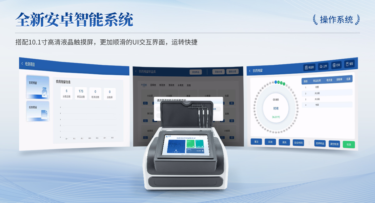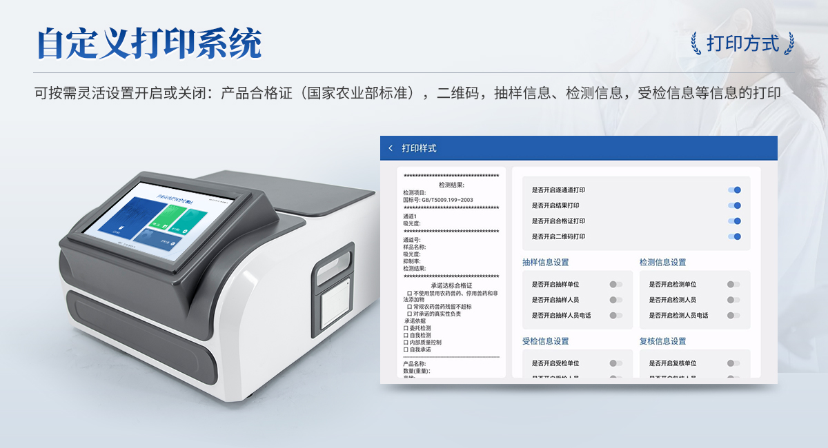 | 1. 試劑位置:3個 | 2. 檢測形式:旋轉(zhuǎn)48通道比色盤,可任意選擇檢測通道,自動對應選擇通道。 | 3. 系統(tǒng)配置:10.1寸高清液晶觸摸屏,采用ARM Cortex-A7,RK3288/4核處理器,運行內(nèi)存1GB。Android7.1.1 系統(tǒng)分辨率1280×800。 | 4.恒溫系統(tǒng):具有自動加溫溫控系統(tǒng),精準恒溫37℃,精度±0.1℃。 | 5.添加系統(tǒng):儀器按照試劑要求自動、按時、按量加入試劑,并且自動對未正常放置的樣本或異常的樣本進行檢查并提示。 | 6.清洗功能:儀器具備回流及自動清洗管路功能,避免試劑污染。 | 7.混勻功能:設備具備自動混勻功能。 | 8.光源校準:設備可自動校準,確保檢測準確度。 | 9.實時監(jiān)控:儀器測試過程中屏幕顯示運行狀態(tài),可實時查看。 | 10.數(shù)據(jù)存儲:內(nèi)部存儲16GB,可存儲500萬條數(shù)據(jù)。 | 11.樣品多選功能:設備具備樣品一鍵多選功能,選擇樣品自動匹配檢測通道。 | 12.項目預設:可提前設置單個及多個相同或不相同的檢測任務,可單次或者多次調(diào)取,減少檢測時間。 | 13.自定義打印系統(tǒng):內(nèi)置自定義打印系統(tǒng),可按需靈活設置開啟或關閉:產(chǎn)品合格證(國家農(nóng)業(yè)部標準),二維碼,抽樣信息、檢測信息,受檢信息等信息的打印。 | 14.A4版本報告打印功能:設備可自動生成A4版報告,A4報告帶二維碼,可掃描二維碼生成電子版,并可識別真?zhèn)巍?/td> | 15.傳輸方式:儀器配備無線通信模塊: 4G(APN)通訊模塊、Wifi模塊,藍牙傳輸模塊,同時具有USB接口以及RJ45接口能以多種方式實現(xiàn)數(shù)據(jù)保存和數(shù)據(jù)傳輸功能,設備數(shù)據(jù)可以同步上傳至平臺。 | 16.數(shù)據(jù)監(jiān)管系統(tǒng):設備自帶監(jiān)管平臺,并可同步對接監(jiān)管平臺,數(shù)據(jù)可局域網(wǎng)和互聯(lián)網(wǎng)數(shù)據(jù)上傳,檢測結(jié)果可直接傳至食品安全監(jiān)管平臺。達到食品安全問題預估、預警。 | 17.系統(tǒng)遠程更新功能:無需設備返廠,即可遠程實時升級全新系統(tǒng),節(jié)省時間成本及避免運輸造成設備損。 |
