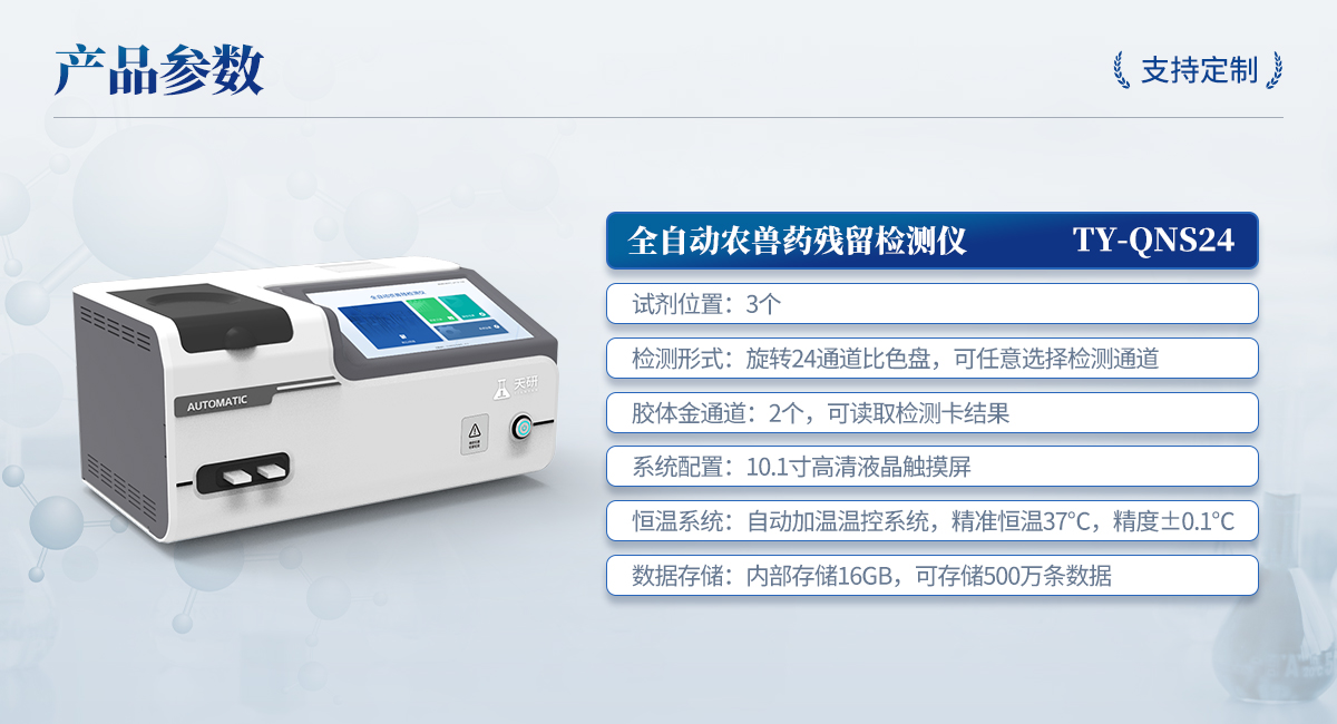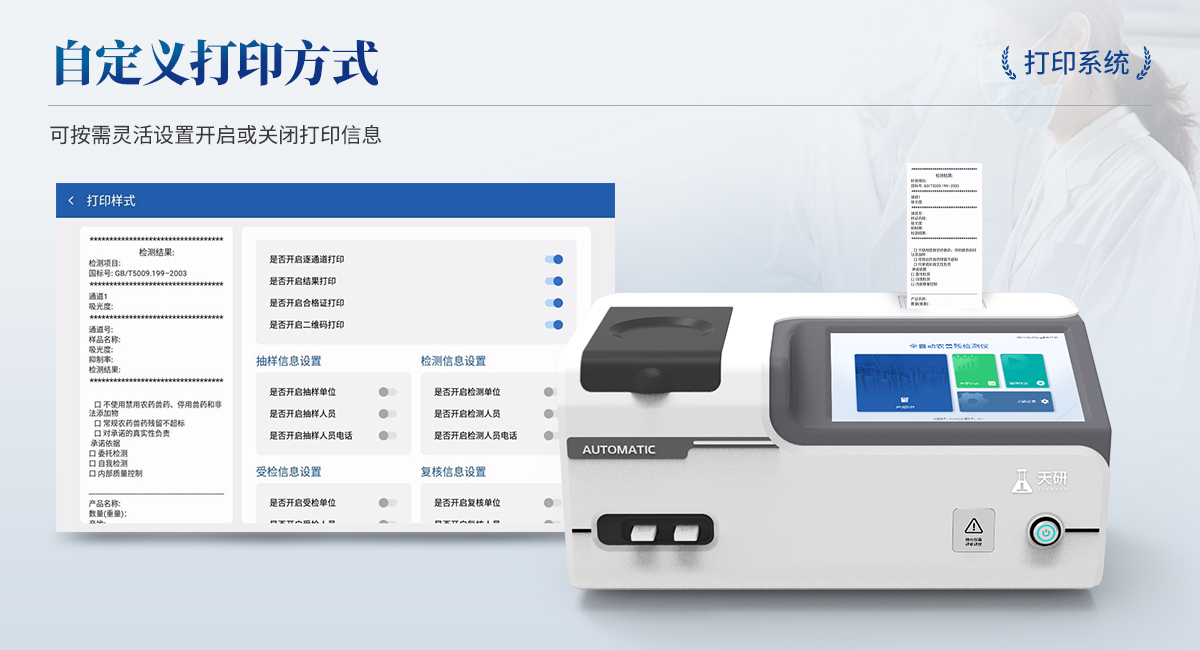 | 1. 試劑位置:3個(gè) | 2. 農(nóng)殘檢測(cè)盤:旋轉(zhuǎn)24通道比色盤,可任意選擇檢測(cè)通道,自動(dòng)對(duì)應(yīng)選擇通道。 | 3. 膠體金通道:2個(gè),可讀取檢測(cè)卡結(jié)果,自動(dòng)采集、處理分析,自動(dòng)判斷檢測(cè)結(jié)果,并具備自動(dòng)判空功能。 | 4.系統(tǒng)配置:10.1寸高清液晶觸摸屏,采用ARM Cortex?-A7,RK3288/4核處理器,運(yùn)行內(nèi)存1GB。Android7.1.1 系統(tǒng)分辨率1280×800。 | 5.恒溫系統(tǒng):具有自動(dòng)加溫溫控系統(tǒng),精準(zhǔn)恒溫37℃,精度±0.1℃。 | 6.添加系統(tǒng):儀器按照試劑要求自動(dòng)、按時(shí)、按量加入試劑,并且自動(dòng)對(duì)未正常放置的樣本或異常的樣本進(jìn)行檢查并提示。 | 7.清洗功能:儀器具備回流及自動(dòng)清洗管路功能,避免試劑污染。 | 8.混勻功能:設(shè)備具備自動(dòng)混勻功能。 | 9.光源校準(zhǔn):設(shè)備可自動(dòng)校準(zhǔn),確保檢測(cè)準(zhǔn)確度。 | 10.實(shí)時(shí)監(jiān)控:儀器測(cè)試過程中屏幕顯示運(yùn)行狀態(tài),可實(shí)時(shí)查看。 | 11.數(shù)據(jù)存儲(chǔ):內(nèi)部存儲(chǔ)16GB,可存儲(chǔ)500萬(wàn)條數(shù)據(jù)。 | 12.樣品多選功能:設(shè)備具備樣品一鍵多選功能,選擇樣品自動(dòng)匹配檢測(cè)通道。 | 13.項(xiàng)目預(yù)設(shè):可提前設(shè)置單個(gè)及多個(gè)相同或不相同的檢測(cè)任務(wù),可單次或者多次調(diào)取,減少檢測(cè)時(shí)間。 | 14.自定義打印系統(tǒng):內(nèi)置自定義打印系統(tǒng),可按需靈活設(shè)置開啟或關(guān)閉:產(chǎn)品合格證(國(guó)家農(nóng)業(yè)部標(biāo)準(zhǔn)),二維碼,抽樣信息、檢測(cè)信息,受檢信息等信息的打印。 | 15.A4版本報(bào)告打印功能:設(shè)備可自動(dòng)生成A4版報(bào)告,A4報(bào)告帶二維碼,可掃描二維碼生成電子版,并可識(shí)別真?zhèn)巍?/td> | 16.傳輸方式:儀器配備無(wú)線通信模塊: 4G(APN)通訊模塊、Wifi模塊,藍(lán)牙傳輸模塊,同時(shí)具有USB接口以及RJ45接口能以多種方式實(shí)現(xiàn)數(shù)據(jù)保存和數(shù)據(jù)傳輸功能,設(shè)備數(shù)據(jù)可以同步上傳至平臺(tái)。 | 17.系統(tǒng)17.數(shù)據(jù)監(jiān)管系統(tǒng):設(shè)備自帶監(jiān)管平臺(tái),并可同步對(duì)接監(jiān)管平臺(tái),數(shù)據(jù)可局域網(wǎng)和互聯(lián)網(wǎng)數(shù)據(jù)上傳,檢測(cè)結(jié)果可直接傳至食品安全監(jiān)管平臺(tái)。達(dá)到食品安全問題預(yù)估、預(yù)警。 | 18.系統(tǒng)遠(yuǎn)程更新功能:無(wú)需設(shè)備返廠,即可遠(yuǎn)程實(shí)時(shí)升級(jí)全新系統(tǒng),節(jié)省時(shí)間成本及避免運(yùn)輸造成設(shè)備損。 |