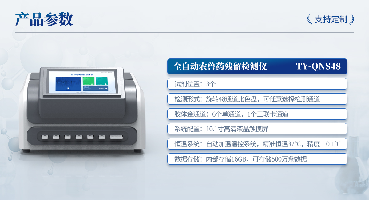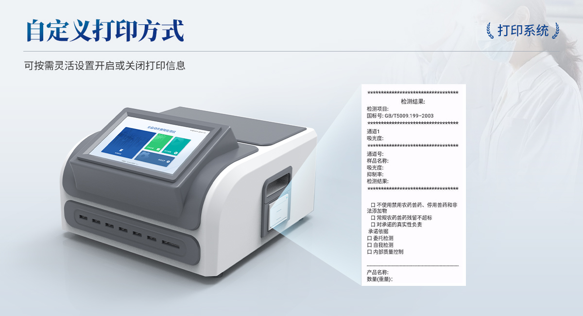 | 1. 試劑位置:3個 | 2. 農(nóng)殘檢測盤:旋轉(zhuǎn)48通道比色盤,可任意選擇檢測通道,自動對應(yīng)選擇通道。 | 3. 膠體金通道:6個單通道,1個三聯(lián)卡通道,可讀取檢測卡結(jié)果,自動采集、處理分析,自動判斷檢測結(jié)果,并具備自動判空功能。 | 4.系統(tǒng)配置:10.1寸高清液晶觸摸屏,采用ARM Cortex-A7,RK3288/4核處理器,運行內(nèi)存1GB。Android7.1.1 系統(tǒng)分辨率1280×800。 | 5.恒溫系統(tǒng):具有自動加溫溫控系統(tǒng),精準(zhǔn)恒溫37℃,精度±0.1℃。 | 6.添加系統(tǒng):儀器按照試劑要求自動、按時、按量加入試劑,并且自動對未正常放置的樣本或異常的樣本進(jìn)行檢查并提示。 | 7.清洗功能:儀器具備回流及自動清洗管路功能,避免試劑污染。 | 8.混勻功能:設(shè)備具備自動混勻功能。 | 9.光源校準(zhǔn):設(shè)備可自動校準(zhǔn),確保檢測準(zhǔn)確度。 | 10.實時監(jiān)控:儀器測試過程中屏幕顯示運行狀態(tài),可實時查看。 | 11.數(shù)據(jù)存儲:內(nèi)部存儲16GB,可存儲500萬條數(shù)據(jù)。 | 12.樣品多選功能:設(shè)備具備樣品一鍵多選功能,選擇樣品自動匹配檢測通道。 | 13.項目預(yù)設(shè):可提前設(shè)置單個及多個相同或不相同的檢測任務(wù),可單次或者多次調(diào)取,減少檢測時間。 | 14.自定義打印系統(tǒng):內(nèi)置自定義打印系統(tǒng),可按需靈活設(shè)置開啟或關(guān)閉:產(chǎn)品合格證(國家農(nóng)業(yè)部標(biāo)準(zhǔn)),二維碼,抽樣信息、檢測信息,受檢信息等信息的打印。 | 15.A4版本報告打印功能:設(shè)備可自動生成A4版報告,A4報告帶二維碼,可掃描二維碼生成電子版,并可識別真?zhèn)巍?/td> | 16.傳輸方式:儀器配備無線通信模塊: 4G(APN)通訊模塊、Wifi模塊,藍(lán)牙傳輸模塊,同時具有USB接口以及RJ45接口能以多種方式實現(xiàn)數(shù)據(jù)保存和數(shù)據(jù)傳輸功能,設(shè)備數(shù)據(jù)可以同步上傳至平臺。 | 17.數(shù)據(jù)監(jiān)管系統(tǒng):設(shè)備自帶監(jiān)管平臺,并可同步對接監(jiān)管平臺,數(shù)據(jù)可局域網(wǎng)和互聯(lián)網(wǎng)數(shù)據(jù)上傳,檢測結(jié)果可直接傳至食品安全監(jiān)管平臺。達(dá)到食品安全問題預(yù)估、預(yù)警。 | 18.系統(tǒng)遠(yuǎn)程更新功能:無需設(shè)備返廠,即可遠(yuǎn)程實時升級全新系統(tǒng),節(jié)省時間成本及避免運輸造成設(shè)備損。 |