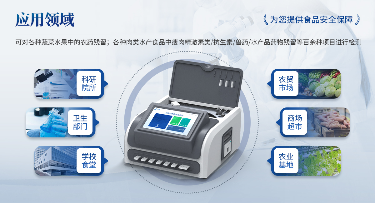 全自動農(nóng)獸藥殘留檢測儀可對各種蔬菜水果中有機(jī)磷和氨基甲酸酯類農(nóng)藥殘留;各種肉類水產(chǎn)食品中瘦肉精激素類殘留,抗生素殘留,獸藥殘留,水產(chǎn)品藥物殘留等百余種項目進(jìn)行快速檢測。該設(shè)備廣泛應(yīng)用于蔬菜批發(fā)市場、超市、商場、食藥監(jiān)等部門的蔬菜和水果中的農(nóng)藥殘留檢測。