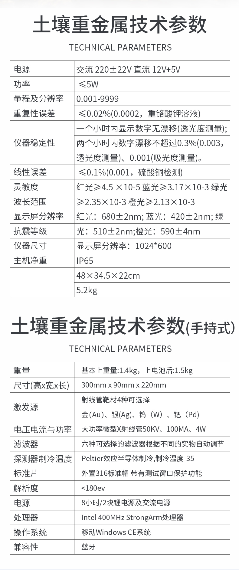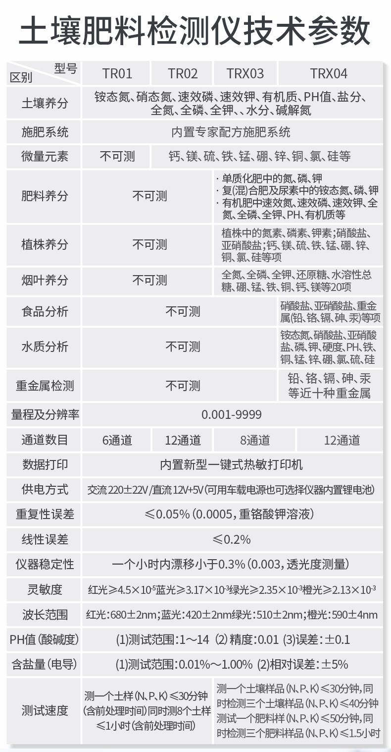 ●土壤銨態(tài)氮、土壤有效磷、土壤速效鉀、土壤硝態(tài)氮、土壤水解氮、土壤全氮、土壤全磷、土壤全鉀、土壤有機質(zhì)(丘林法)、土壤有機質(zhì)(浸提法)、土壤總有機碳、土壤碳氮比、PH值、含鹽量、水分。 ●土壤中微量元素:土壤鈣、土壤鎂、土壤硫、土壤硅、土壤硼、土壤鐵、土壤銅、土壤錳、土壤鋅、土壤氯、土壤鉬; ●土壤重金屬:土壤鉛、土壤砷、土壤鎘、土壤鉻、土壤汞、土壤鎳、土壤鋁、土壤氟、土壤鈦、土壤硒。 |
