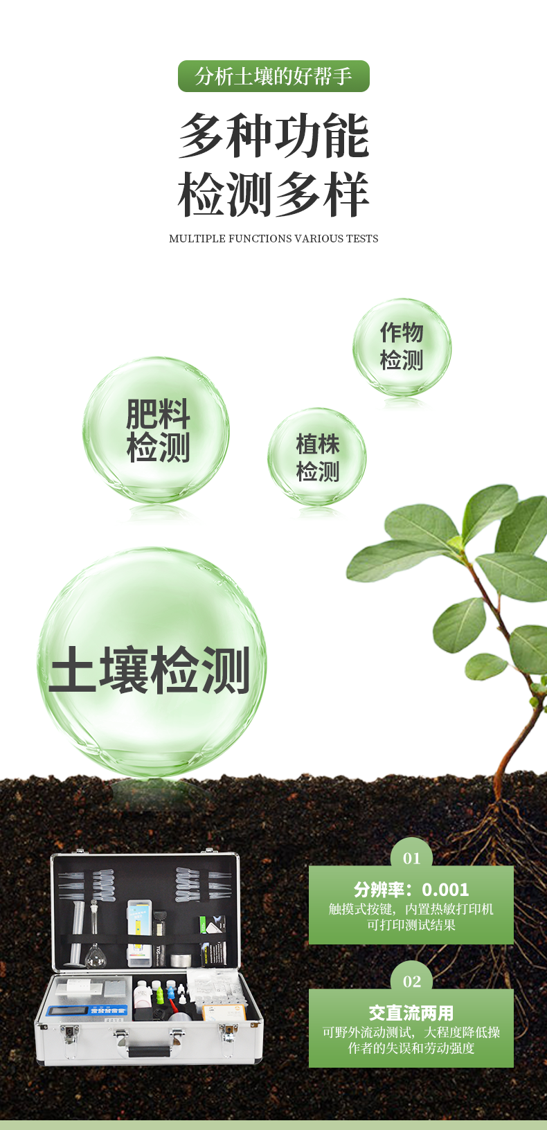 | 土壤養(yǎng)分:● 銨態(tài)氮、速效磷、速效鉀、水份、有機質(zhì)、酸堿度、以及鈣、鎂、硫、硼、氯、硅等各種中微量元素; | 肥料養(yǎng)分:● 單質(zhì)化肥中的氮、磷、鉀; ● 復(混)合肥及尿素中的銨態(tài)氮、磷、鉀; ● 有機肥中速效氮、速效磷、速效鉀、全氮、全磷、全鉀、pH、有機質(zhì)等。 |