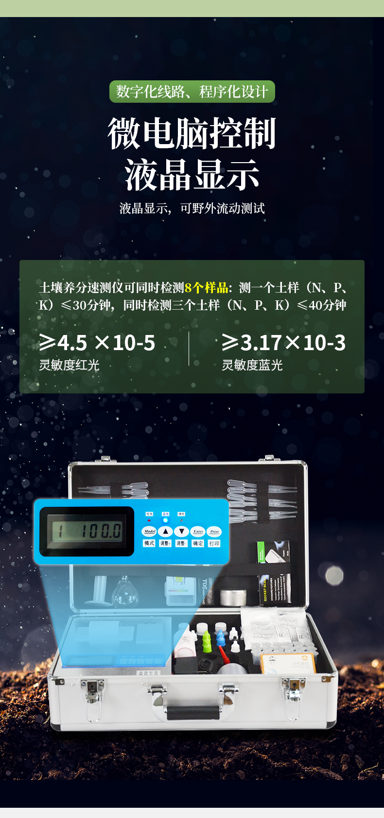 | 可同時檢測8個樣品; | 測一個土樣(N、P、K)≤30分鐘,同時檢測三個土樣(N、P、K)≤40分鐘; | 測一個肥料(N、P、K)≤50分鐘,同時檢測三個土樣(N、P、K)≤1.5小時。 |