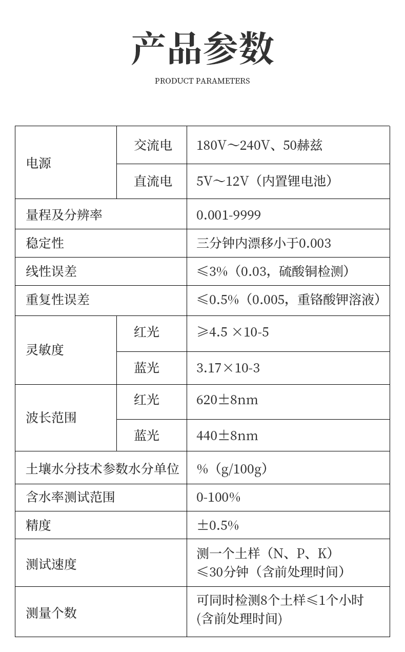 | 1.電源:交流電:180V~240V、50赫茲;直流電:12V+5V(可接車載電源) | 2.量程及分辨率:0.001-9999 | 3.穩(wěn)定性:三分鐘內(nèi)漂移小于0.003 | 4.線性誤差:≤3%(0.03,硫酸銅檢測) | 5.重復性誤差:≤0.5%(0.005,重鉻酸鉀溶液) | 6.靈敏度:紅光≥4.5 ×10-5 藍光≥3.17×10-3 | 7.波長范圍:紅光620±8nm 藍光440±8nm | 8.土壤水分技術(shù)參數(shù)水分單位:﹪(g/100g)含水率測試范圍:0-100﹪ 精度:±0.5﹪ | 9.土壤中速效N、P、K三種養(yǎng)分一次性同時浸提測定、科學推薦施肥量 | 10. 肥料中氮(N)、磷(P)、鉀(K)等養(yǎng)分同時、快速、準確檢測 | 11.測試速度:測一個土樣(N、P、K)≤30分鐘(含前處理時間) | 12 .可同時檢測8個土樣≤1個小時(含前處理時間) | 13. 數(shù)據(jù)打印:內(nèi)置高檔一鍵式熱敏打印機(國內(nèi)首家**設(shè)計) (**號:ZL 2018 2 1777724.7) |