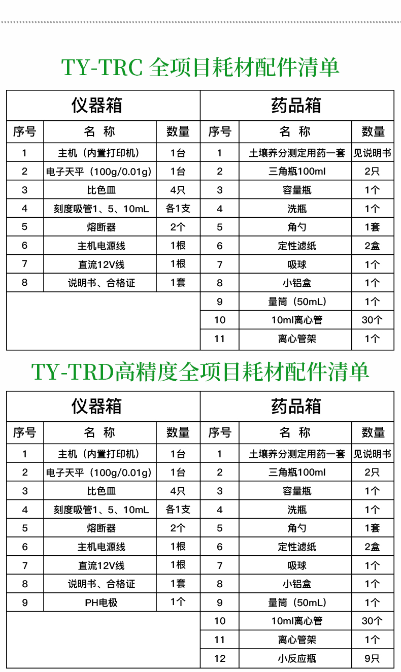 | 藥 品 箱 | 土壤養(yǎng)分測定用藥 :1套/100次 | 三角瓶100ml :2只 | 容量瓶 :1個 | 洗瓶 :1個 | 角勺 :1套 | 定性濾紙 :1盒 | 吸球 :1個 | 小鋁盒 :1個 | 量筒(50mL) :1個 | 10ml離心管 :30個 | 離心管架 :1個 |