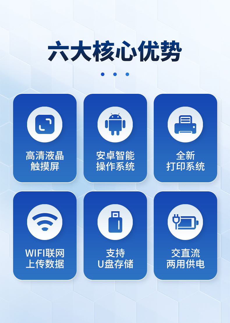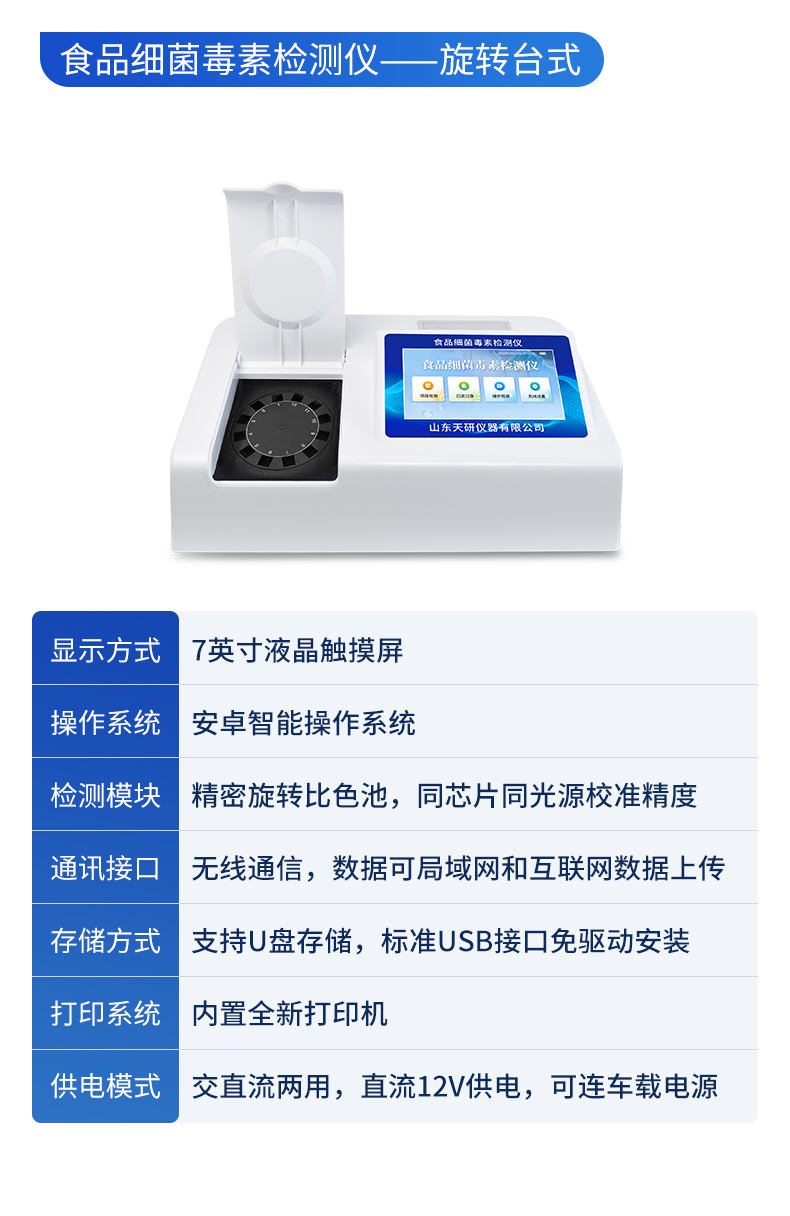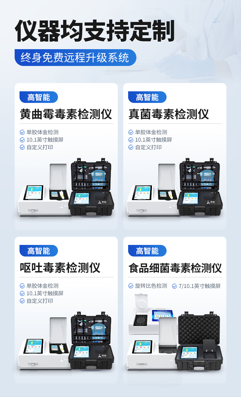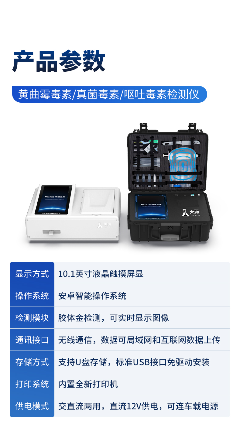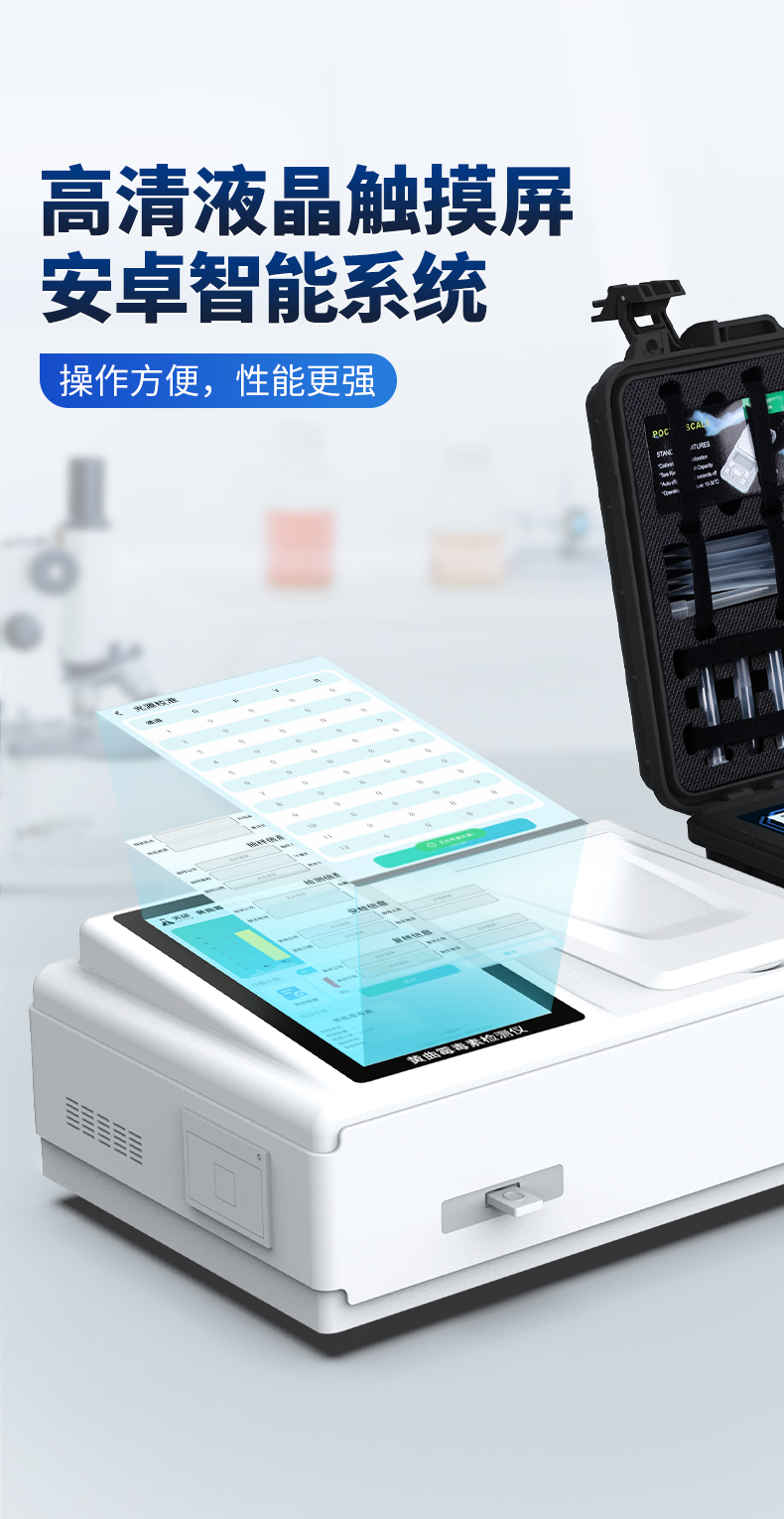 | 1、儀器采用10.1英寸液晶觸摸屏顯,搭配運行安卓智能操作系統(tǒng),主控芯片采用ARM Cortex-A7,RK3288/4核處理器,主頻1.88Ghz,運轉(zhuǎn)速度更快速,性能更強。 | 2、儀器功能包括:膠體金檢測模塊、數(shù)字化管理模塊、無線通訊模塊等,可以滿足同一軟件下實現(xiàn)所有檢測項目的檢測,并在同一窗口展示檢測結(jié)果。 | 3.一體化臺式快檢設備,采用交直流兩用供電方式,可連接車載電源,配備6ah大容量充電鋰電池,可以滿足現(xiàn)場及流動檢測使用的需求。儀器尺寸:43×35×20cm, 主機凈重:5.1kg | 4、系統(tǒng)自帶數(shù)據(jù)集成模塊,設備首頁自動統(tǒng)計檢測數(shù)據(jù)包含:周檢測數(shù)據(jù)、月檢測數(shù)據(jù),全部檢測總數(shù)量,均包含檢測總數(shù),合格數(shù),不合格數(shù),以及相關柱形分析圖,對各項檢測數(shù)據(jù)清晰掌握,無需電腦查詢,更加快捷直觀。 | 5、儀器具有任務預設模塊,可在樣品送檢前提前預設樣品名稱、檢測指標、送檢單位等信息,樣品送檢時一鍵調(diào)取保存信息,檢測更加方便快捷。 | 6、膠體金檢測模塊: | 直插式自動掃描方式,可實時顯示金標卡實時圖像,系統(tǒng)自動分析并呈現(xiàn)出CT曲線圖,CT線自動識別,無需手動調(diào)整,完成檢測后自動退出檢測卡。 | 結(jié)果判定線可修改,對照值標定值可保存,斷電不丟失數(shù)據(jù)。 | 兼容市場上其他膠體金卡,使用耗材不受限制,極大增強用戶使用體驗。 | 7、儀器檢測系統(tǒng)擁有龐大數(shù)據(jù)庫,并且構(gòu)建了完善的檢索、修訂功能。食品庫涵蓋多種樣品名稱,可按需添加或刪除、編輯樣品名稱;產(chǎn)品數(shù)據(jù)庫以及歷史檢測記錄支持一鍵檢索功能。 | 8、系統(tǒng)打印自定義化,打印格式多樣化,產(chǎn)品合格證(國家標準要求),二維碼,抽樣信息、檢測信息,受檢信息、復核信息、抽樣日期、檢測日期等信息結(jié)果,可按需求自行設置打印內(nèi)容。 | 9、A4紙版本報告打印功能(可選配):設備擁有兩種結(jié)果展示方式,可以自動生成A4打印模板和小票打印模板兩種樣式,可通過WiFi及網(wǎng)線等方式鏈接外置打印機可進行打印 | 10、儀器具有 wifi 聯(lián)網(wǎng)上傳、RJ45網(wǎng)線連接功能,可以快速上傳數(shù)據(jù)。同步對接監(jiān)管平臺,數(shù)據(jù)可局域網(wǎng)和互聯(lián)網(wǎng)數(shù)據(jù)上傳,檢測結(jié)果直接傳至食品安全監(jiān)管平臺。進行區(qū)域食品安全監(jiān)管及大數(shù)據(jù)分析處理與數(shù)據(jù)統(tǒng)計,檢測區(qū)域食品安全長短期動態(tài),達到食品安全問題預估、預警。 | 11、設備支持U盤存儲,標準USB接口,免驅(qū)動安裝。檢測結(jié)果存儲容量20萬條以上,可生成Excel表格,進行一鍵拷貝,并具有登錄保護功能,可設置用戶名及密碼,規(guī)范不同人員操作權(quán)限,防止非工作人員操作,并且可以進行重新校準、鎖定、恢復出廠設置功能。儀器固件可升級,后期檢測項目可擴充。 | 12、儀器具備遠程升級功能,可定向分客戶分儀器更新,開機后自動更新,并可持續(xù)性免費更新系統(tǒng)版本,無需像傳統(tǒng)產(chǎn)品返廠更新,節(jié)省時間及人力成本并避免了物流運輸返廠升級導致設備損壞的潛在風險。 |