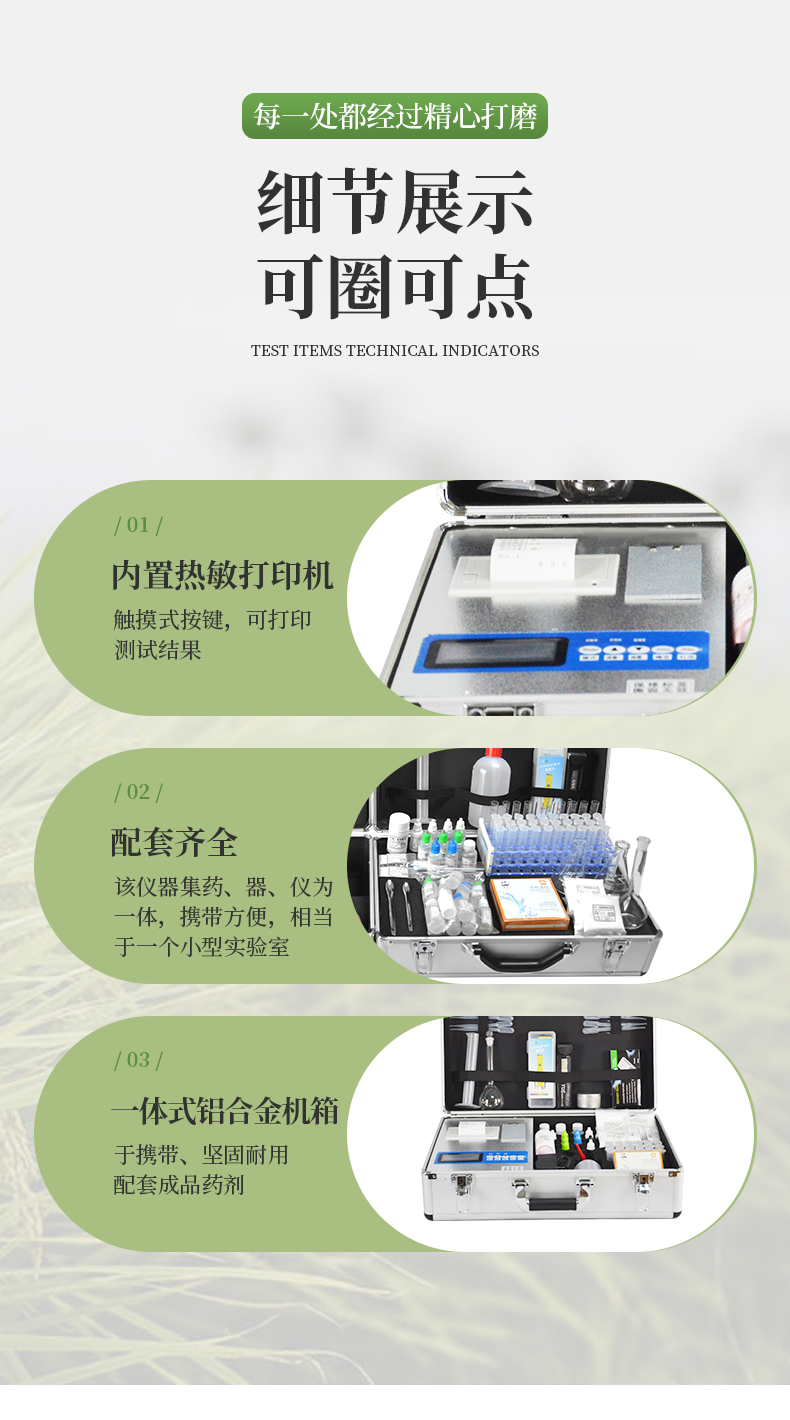 | 1、《機箱/藥劑一體式鋁合金機箱》設(shè)計,便于攜帶、堅固耐用,配套成品藥劑。 | 2、微電腦控制,數(shù)字化線路、程序化設(shè)計,液晶顯示,交直流兩用,可野外流動測試,大程度降低操作者的失誤和勞動強度。 | 3、分辨率:0.001,觸摸式按鍵,內(nèi)置**熱敏打印機,可打印測試結(jié)果。 | 4、全項目土壤肥料養(yǎng)分檢測儀可檢測土壤及化肥、有機肥(含葉面肥、水溶肥、噴施肥等)、植株中的速效氮、速效磷、有效鉀、全氮、全磷、全鉀、有機質(zhì)、酸堿度,鈣、鎂、硫、鐵、錳、硼、鋅、銅、氯、硅、鉬等各種中微量元素以及鉛、鉻、鎘、汞、砷、鎳、鋁、氟、鈦、硒等各種重金屬含量。 | 5、采用高亮LED燈光源、雙撥輪濾光式處理技術(shù),保證光源波長穩(wěn)定, 硅半導(dǎo)體作為信號接收系統(tǒng), 壽命長達10萬小時級別。光源穩(wěn)定,重現(xiàn)性好,準(zhǔn)確度高。 | 6、比色槽部分采用單通道設(shè)計,無機械位移及磨損,光路測試定位**,保證測定結(jié)果精度。 | 7、配套專家施肥系統(tǒng)數(shù)據(jù),可對百余種全國農(nóng)業(yè)、果樹、 經(jīng)濟作物的目標(biāo)產(chǎn)量科學(xué)計算推薦施肥量。 | 8、采用高精度濾光片技術(shù)自主**分析方法(**號:ZL 2018 2 1777724.7),保證檢測結(jié)果優(yōu)于國標(biāo)要求。 |