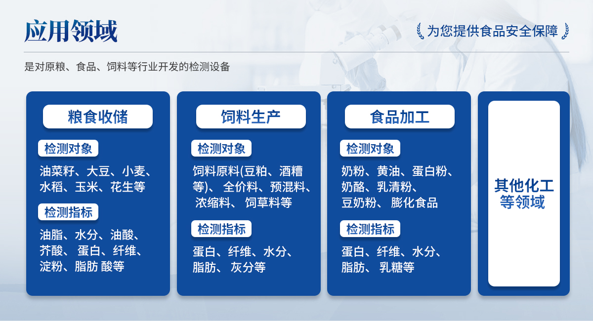 檢測對象:飼料原料(豆粕、酒糟等)、全價(jià)料、預(yù)混料、濃縮料、飼草料等 檢測指標(biāo):蛋白、纖維、水分、脂肪、灰分等; | ◆ 食品加工: