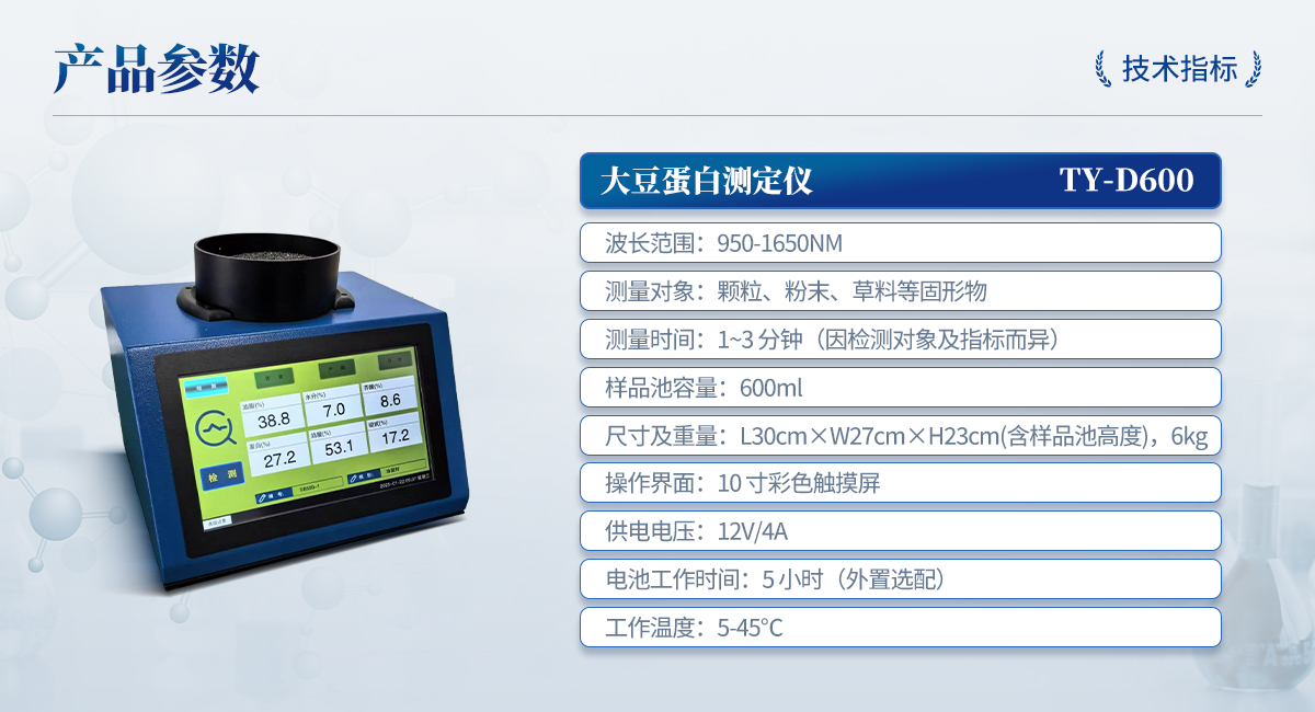 | 波長范圍:950-1650nm | 測量對象:顆粒、粉末、草料等固形物 | 測量時(shí)間:1~3 分鐘(因檢測對象及指標(biāo)而異) | 樣品池容量:600ml | 尺寸及重量:L30cm×W27cm×H23cm(含樣品池高度),6kg | 操作界面:10 寸彩色觸摸屏 | 供電電壓:12V/4A | 電池工作時(shí)間:5 小時(shí)(外置選配) | 工作溫度:5-45℃ |