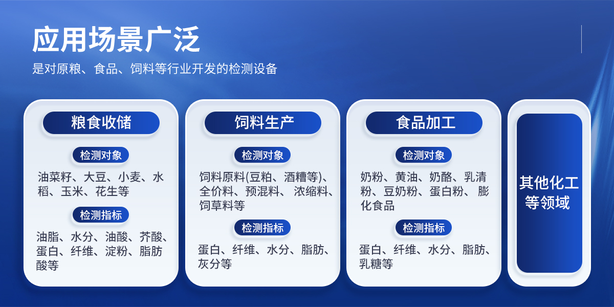 檢測(cè)對(duì)象:奶粉、黃油、奶酪、乳清粉、豆奶粉、蛋白粉、膨化食品; 檢測(cè)指標(biāo):蛋白、纖維、水分、脂肪、乳糖等; | ◆ 其他化工等領(lǐng)域 |