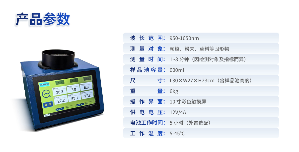 | 波長(zhǎng)范圍:950-1650nm | 測(cè)量對(duì)象:顆粒、粉末、草料等固形物 | 測(cè)量時(shí)間:1~3 分鐘(因檢測(cè)對(duì)象及指標(biāo)而異) | 樣品池容量:600ml | 尺寸及重量:L30cm×W27cm×H23cm(含樣品池高度),6kg | 操作界面:10 寸彩色觸摸屏 | 供電電壓:12V/4A | 電池工作時(shí)間:5 小時(shí)(外置選配) | 工作溫度:5-45℃ |