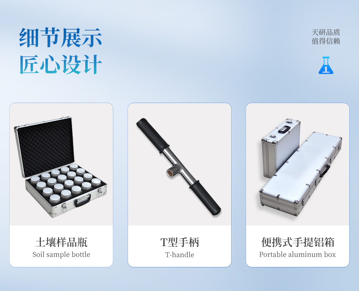| 規(guī)格 | 長 35cm ,螺紋連接 | 長 30 cm ,帶有刻度,螺紋連接 | 長 50 cm ,帶有刻度,螺紋連接 | 長 100cm ,帶有刻度,螺紋連接 | 刀寬 7cm ,刀間距 5cm ,采樣長度 20cm ,螺紋連接,不銹鋼材質(zhì),特殊硬化處理,免去生銹煩惱,便于打理維護(hù) | 刀寬 3cm ,刀間距 6cm ,采樣長度 20cm ,螺紋連接,不銹鋼材質(zhì),特殊硬化處理,免去生銹煩惱,便于打理維護(hù) | 采樣直徑 7cm,螺紋連接,錳鋼材質(zhì),堅(jiān)硬耐磨 | 不銹鋼材質(zhì)、采樣直徑 5cm、采樣長度 20cm,螺紋連接 | 不銹鋼材質(zhì),寬 20mm | 19×22mm | 牛皮,手背透氣, | 3 米 | 用于擦拭鉆具 | 內(nèi)置 EVA防震內(nèi)襯,用于裝上述鉆具,便于戶外攜帶 | 250ml 、測土壤有機(jī)物專用土樣保存瓶,乳白色 |