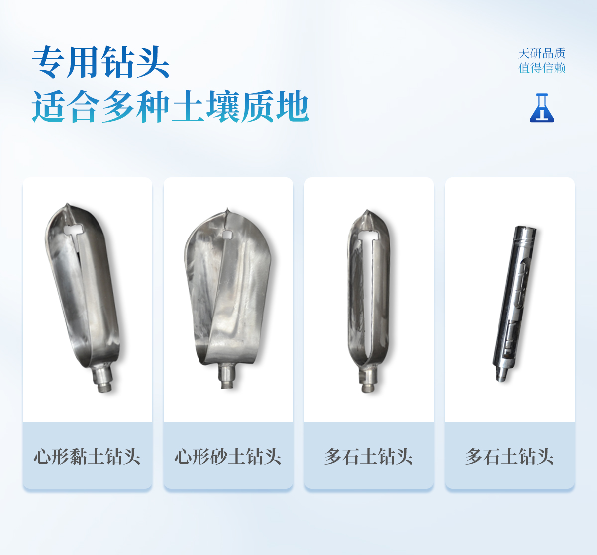 | 可針對不同直徑的土壤顆粒配備不同的專用鉆頭,對不同深度和區(qū)域的土壤進(jìn)行合理采樣和分類。 |