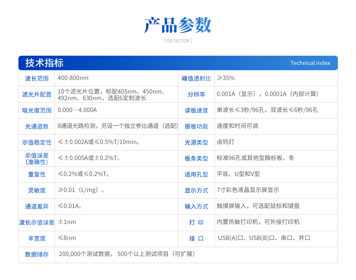 產(chǎn)品特點:1. 內(nèi)置嵌入式系統(tǒng),無需外接電腦即可操作、存儲、打印。2. 全屏顯示96孔整板數(shù)據(jù), 直觀的可視化布板操作界面。3. 便捷的觸摸屏輸入,另可選配外接鼠標(biāo)和鍵盤。4. 測量模式:單波長檢測,雙波長檢測,兩點法,動力學(xué)法,酶抑制率,終點法、速率法。5. 可選擇吸光度、Cut-Off定性計算、單點定標(biāo)、折線回歸、線性回