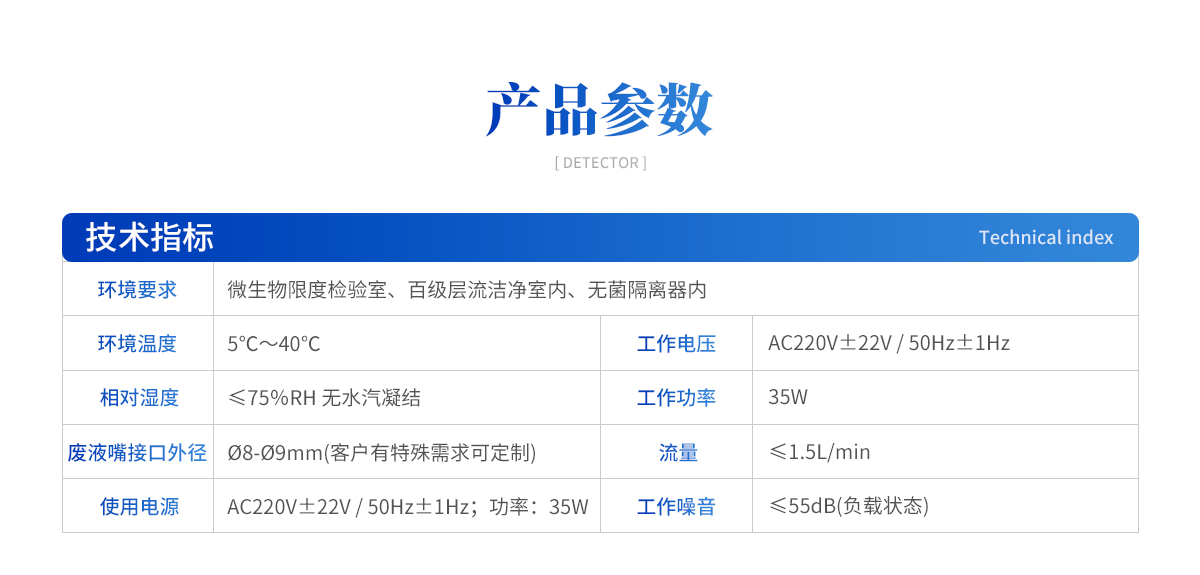 | ① 環(huán)境要求:微生物限度檢驗(yàn)室、百級(jí)層流潔凈室內(nèi)、無(wú)菌隔離器內(nèi) ② 環(huán)境溫度:5℃~40℃ ③ 相對(duì)濕度:≤75%RH 無(wú)水汽凝結(jié) ④ 廢液嘴接口外徑:?8-?9mm(客戶(hù)有特殊需求可定制) ⑤ 使用電源:AC220V±22V / 50Hz±1Hz;功率:35W |