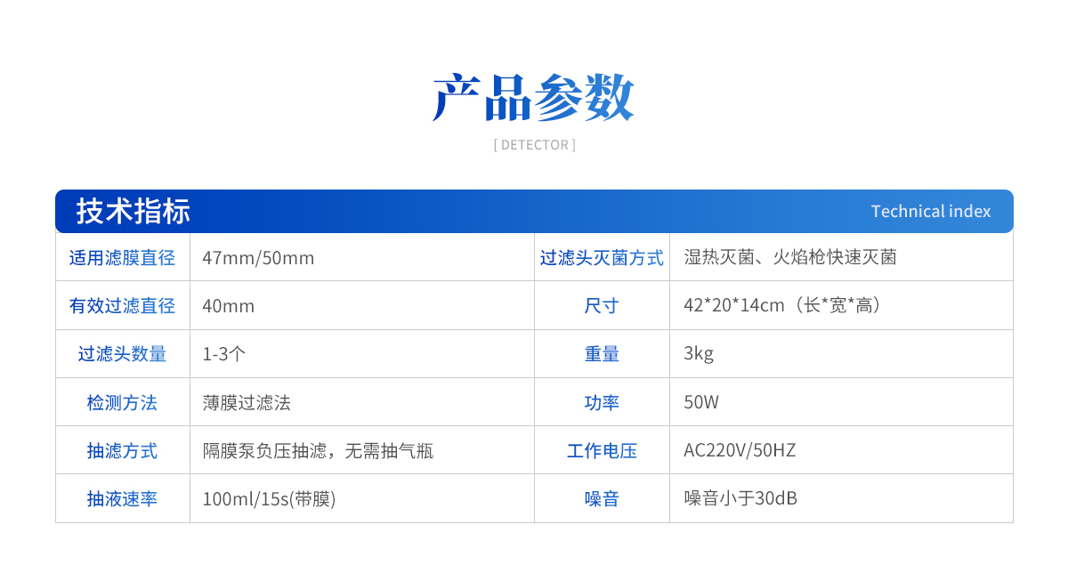 | 1、適用濾膜直徑:47mm/50mm 2、有效過濾直徑:40mm 3、過濾頭數(shù)量:1-3個(gè) 4、檢測方法:薄膜過濾法 5、抽濾方式:隔膜泵負(fù)壓抽濾,無需抽氣瓶 6、抽液速率:100ml/15s(帶膜) 7、過濾頭滅菌方式:濕熱滅菌、火焰槍快速滅菌 8、尺寸:42*20*14cm(長*寬*高) 9、重量:3kg 10、功率:50W 11、工作電壓:AC220V/50HZ 12、噪音小于30dB 13、物理按鈕開關(guān) 14、可選擇三頭、六頭結(jié)構(gòu),選型豐富 |