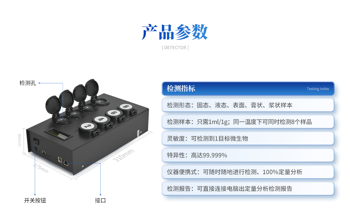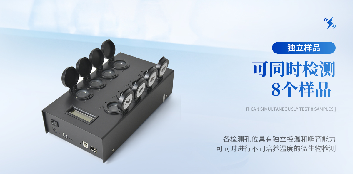 大腸桿菌檢測(cè)儀主要特點(diǎn):1) 可檢測(cè)固態(tài)、液態(tài)、表面、膏狀、漿狀樣本2) 樣本在檢測(cè)時(shí)無(wú)需任何的前處理過(guò)程,直接丟入檢測(cè)瓶即可3) 可自動(dòng)控制孵育溫度和孵育時(shí)間4) 檢測(cè)樣本只需1ml/1g;同一溫度下可同時(shí)檢測(cè)8個(gè)樣品5) 靈敏度高達(dá)可檢測(cè)到1目標(biāo)微生物;特異性高達(dá)99.999%6) 獨(dú)立、持續(xù)的檢測(cè)并記錄瓶中的微生物數(shù)量(CFU)7)