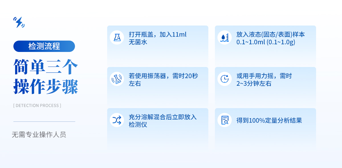| 1) 可檢測(cè)固態(tài)、液態(tài)、表面、膏狀、漿狀樣本 | 2) 樣本在檢測(cè)時(shí)無(wú)需任何的前處理過(guò)程,直接丟入檢測(cè)瓶即可 | 3) 可自動(dòng)控制孵育溫度和孵育時(shí)間 | 4) 檢測(cè)樣本只需1ml/1g;同一溫度下可同時(shí)檢測(cè)8個(gè)樣品 | 5) 靈敏度高達(dá)可檢測(cè)到1目標(biāo)微生物;特異性高達(dá)99.999% | 6) 獨(dú)立、持續(xù)的檢測(cè)并記錄瓶中的微生物數(shù)量(CFU) | 7) 簡(jiǎn)單三個(gè)操作步驟,傻瓜型,無(wú)需專(zhuān)業(yè)操作人員 | 8) 儀器便攜式,可隨時(shí)隨地進(jìn)行檢測(cè)、100%定量分析,并可直接連接電腦出定量分析檢測(cè)報(bào)告 |