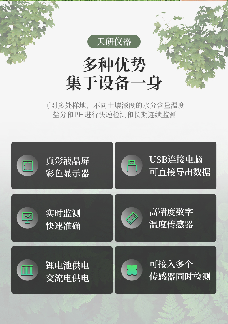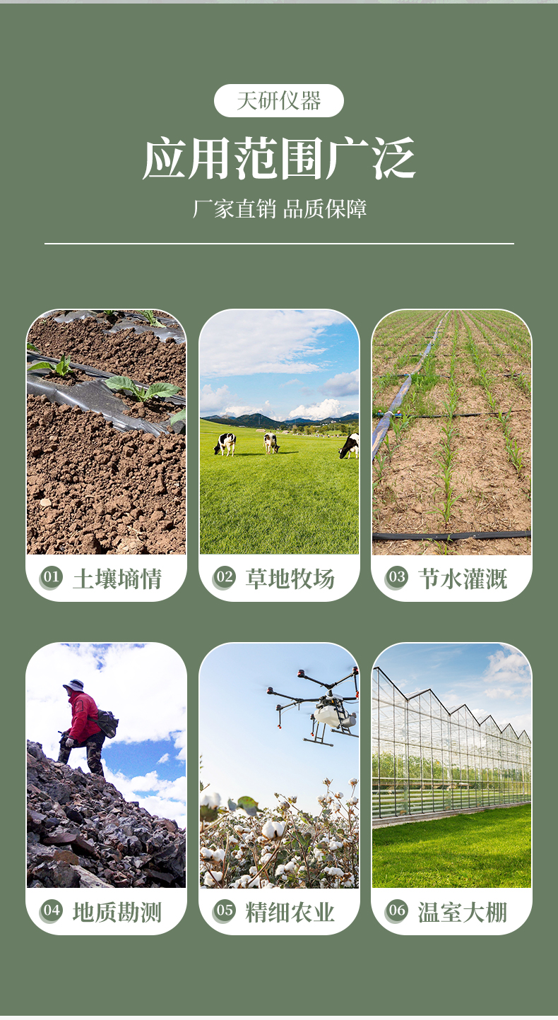 土壤水分測定儀采用FDR頻域反射原理,快速準確測量土壤中含水量,可對多處樣地、不同土壤深度的水分含量進行快速檢測和長期連續(xù)監(jiān)測。廣泛應用于土壤墑情檢測、旱作節(jié)水灌溉、精細農業(yè)、林業(yè)、地質勘探、植物培育等領域。